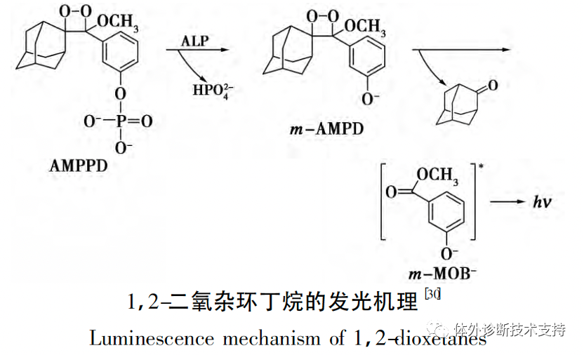 从1969 年Kopecky 和Mumford首次合成这类化合物以来,目前已经制备了100 多种二氧杂环丁烷类化合物。其中,具有代表性的是3-( 2'-螺旋金刚烷酮) -4-甲氧基-4( 3″-磷氧酰苯基) -1,2-二氧杂环丁烷( AMPPD) 。1,2-二氧杂环丁烷类的化学发光机理 ( 以AMPPD 为例) 为:AMPPD 在碱性磷酸酶( ALP) 的催化下,形成一个极不稳定的中间体m-AMPD; m-AMPD 迅速分解为一分子的金刚烷酮和一分子激发态间氧阴离子苯甲酸甲酯( m-MOB- ) ; 激发态的m-MOB-返回基态的过程中发射光子。