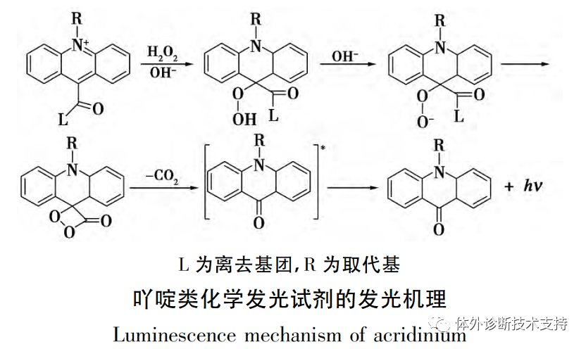 是在碱性条件下,过氧化氢与吖啶的9位碳原子发生加成,加成产物在碱性条件下形成的过氧负离子再亲核进攻羰基碳,离去基团离去并进一步形成不稳定的四元环中间体,开环后形成激发态的吖啶酮,其返回到基态的过程中释放出光子。