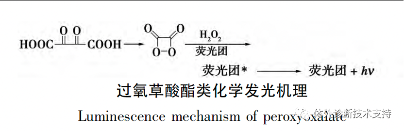 过氧草酸酯是以多氯水杨酸酯与草酰氯反应生成的草酸酯化合物,其化学发光机制可归结于化学致电子交换发光过程。此外,化学发光的基态产物是一类具有单重态或三重态的二氯乙烷分子。过氧草酸酯由于反应效率高及发光度强,现已被广泛应用于各种化学发光冷光源。