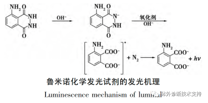 鲁米诺、异鲁米诺(lsolumino1)及其衍生物是最早在CLIA 中使用的一种常用的化学发光物质。鲁米诺类物质的发光为氧化反应发光。在碱性溶液中, 鲁米诺可被许多氧化剂氧化而发光, 其中H2O2 最为常用。