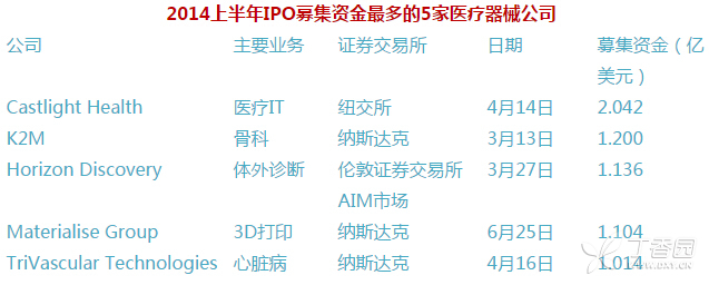 未来,随着FDA为加速器械产品上市的努力,如简化监管程序,加速PMA项目等,这个数字应该会持续增加。 热衷上市募集资金 今年出现的另一个新趋势是,过去公司们更愿意保持独立,而现在则期望交易。分析显示,今年上半年医疗器械公司通过IPO募集了13亿美元资金。这个数字比2013年全年的9亿美元还要多44%。 虽然对于所有行业来说,现在上市要比以前容易,但是医疗器械行业2014年的增幅实在是巨大的,而且募集资金量也有显著的增长。这是一个重大的变化。