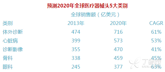 从某种意义上来说,医疗器械行业正在屏息而待,看谁能成为新的领头羊。美敦力和柯惠的交易是最重要的,它不仅将创造新的行业领军者,而且会深刻地影响心血管、神经科和骨科市场。另外,紧随其后的两笔大交易,Zimmer-Biomet以及碧迪(Becton Dickinson)-Care Fusion也将对行业产生重要影响。 行业内热衷整合的原因之一是整体增长速度的放缓。EvaluateMedTech预测,2013年至2020年医疗器械市场每年的增幅为5%,比起同时期市场预测的处方药5.3%的增幅要小。 不过有一个领域是个例外,那就是体外诊断(IVD)。预计2020年体外诊断将成为医疗器械行业规模最大的领域,销售额达716亿美元。其次是心脏病领域,预计销售额将达573亿美元。报告预测体外诊断领域的领头羊将是罗氏,该公司2020年体外诊断的收入将达122亿美元,是第二名西门子(Siemens)的几乎两倍。