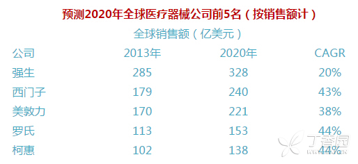 据EvaluateMedTech发布的最新报告,预计2020年全球医疗器械市场将达到5140亿美元,首次突破5000亿美元大关。排名第一的公司将是强生(Johnson & Johnson),预测该公司2020年医疗器械收入将达328亿美元。 据预测:全球医疗器械公司到2020年竞争格局将会依照这样的排名——强生居首,西门子、美敦力、罗氏、柯惠分列第二至第五位。 不过强生公司坐上头把交椅基于一个假设:美敦力(Medtronic)收购柯惠(Covidien)的交易无法完成。这一医疗器械史上最大交易——交易金额高达430亿美元,原计划将在2015年第一季度完成;如果完成,几乎肯定美敦力将成为2020年医疗器械行业的领军者。不过,现在这一交易能否完成尚存在变数。