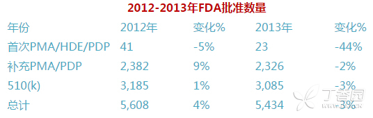 而且预测体外诊断是增长最快的领域之一,年增长率为6.1%,仅仅次于眼科。眼科的年增长率为6.3%。 更多产品获批上市 另一个变化是在监管方面,FDA希望能够比之前批准更多的器械产品。FDA有很大的动力这么做:报告显示,2013年FDA仅仅批准23个首次上市前审批(PMA),这个数字比前一年少了44%。 幸运的是,这种状况在2014年出现了改观。截至8月底,8个月里FDA批准了20个首次PMA,相对于去年同期的14个增长了43%。与2013年相同,批准最多的是体外诊断产品,尤其是分子诊断产品,共批准了4个分子诊断产品。