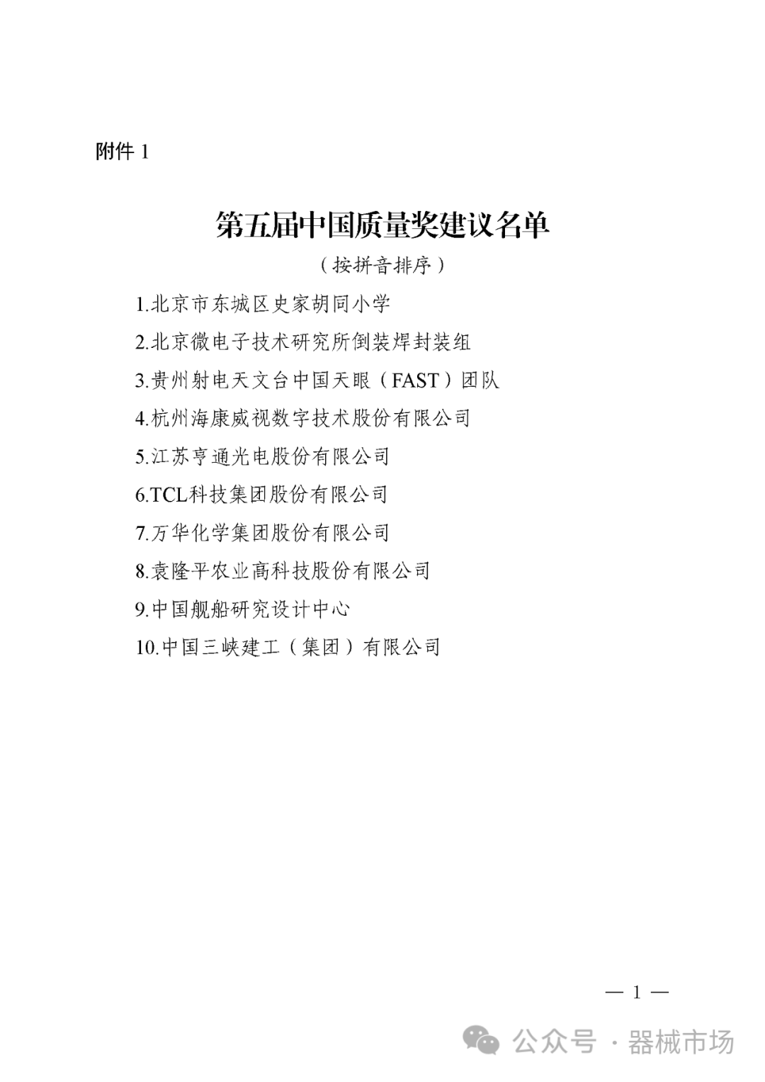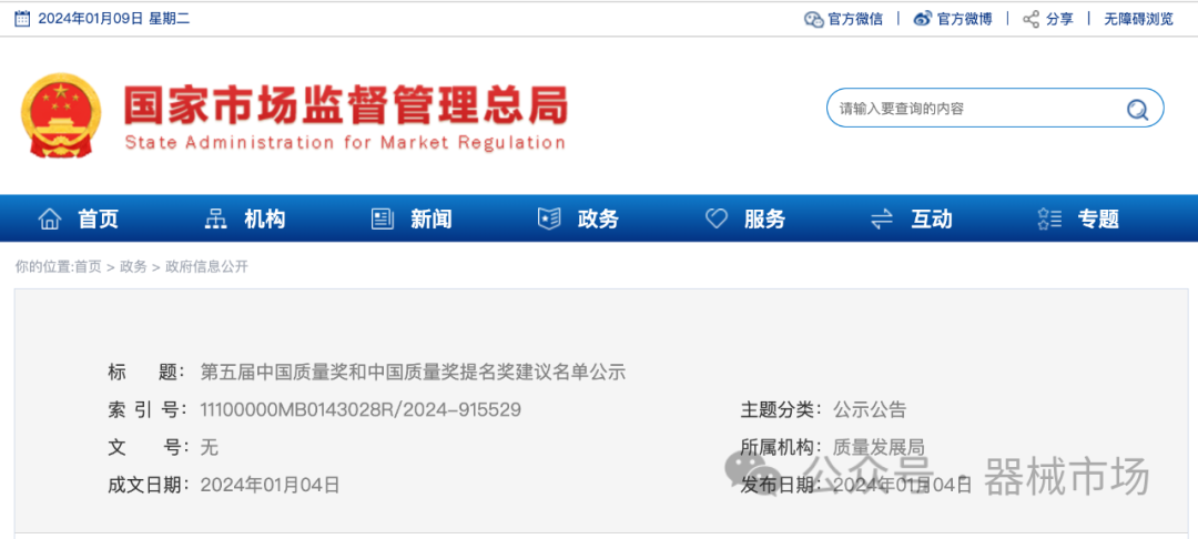 第五届中国质量奖和中国质量奖提名奖建议名单公示