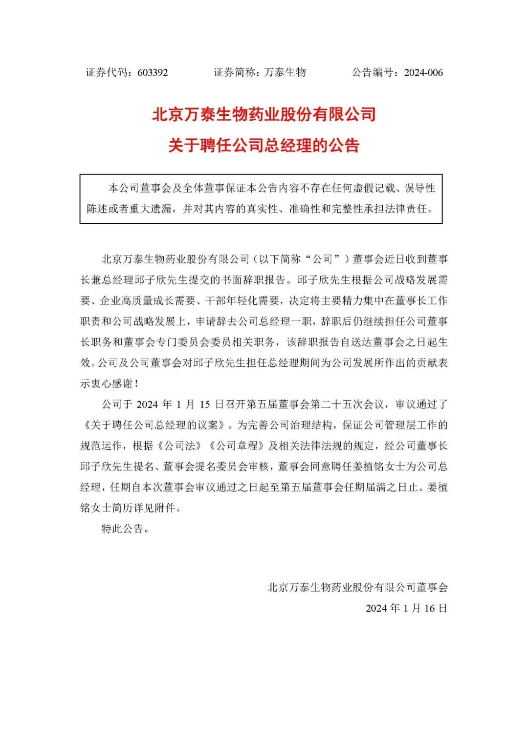 万泰生物1月15日公告,公司董事会近日收到董事长兼总经理邱子欣提交的书面辞职报告。邱子欣根据公司战略发展需要、企业高质量成长需要、干部年轻化需要,决定将主要精力集中在董事长工作职责和公司战略发展上,申请辞去公司总经理一职,辞职后仍继续担任公司董事长职务和董事会专门委员会委员相关职务,该辞职报告自送达董事会之日起生效。