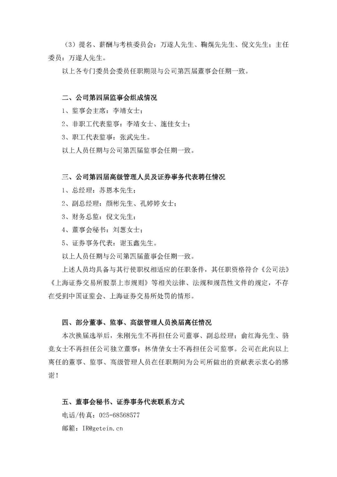 本次换届选举后,朱刚先生不再担任公司董事、副总经理;俞红海先生、骆竞女士不再担任公司独立董事;林倩倩女士不再担任公司监事。