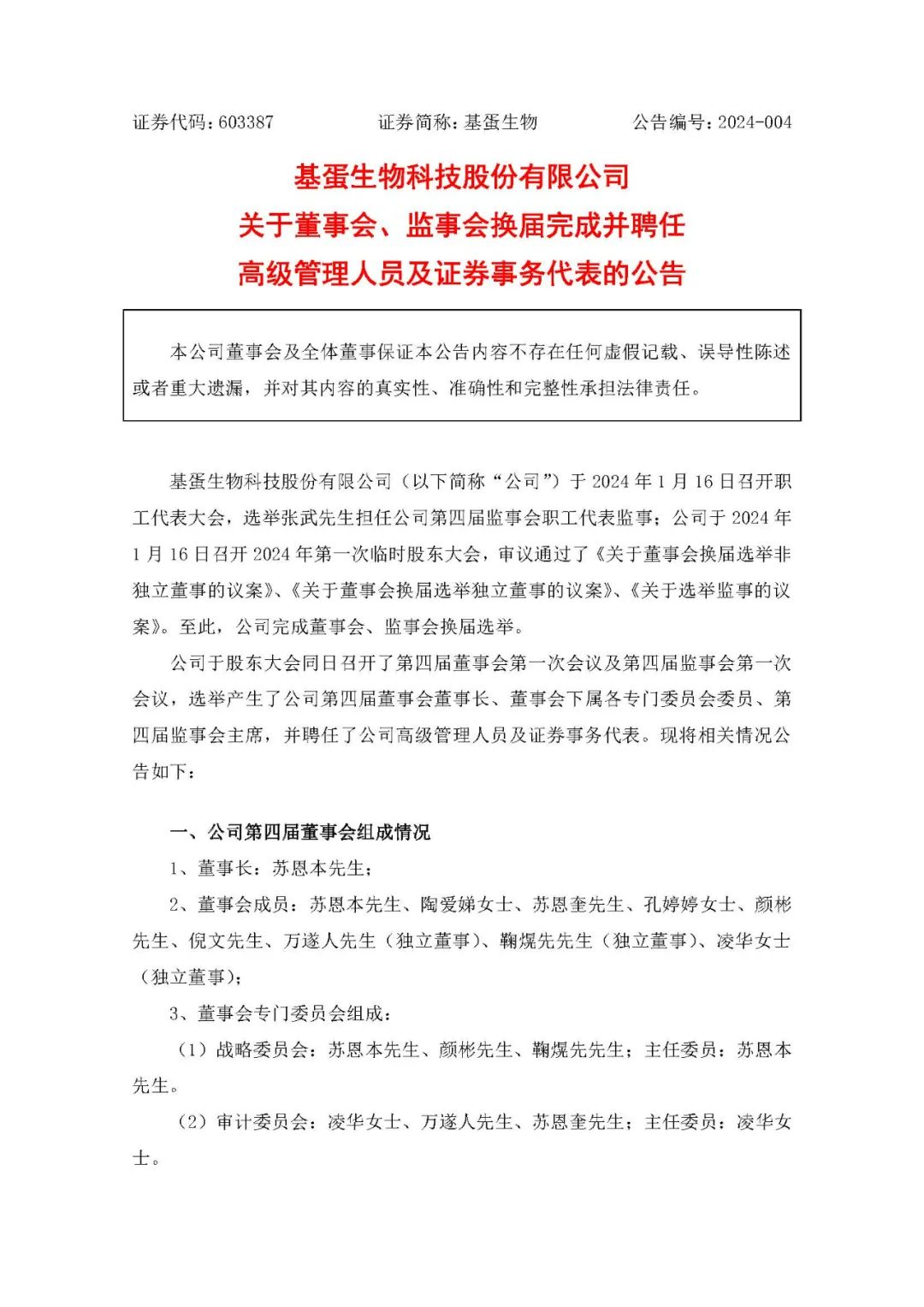 近日,基蛋生物召开了第四届董事会第一次会议及第四届监事会第一次会议,选举产生了公司第四届董事会董事长、董事会下属各专门委员会委员、第四届监事会主席,并聘任了公司高级管理人员及证券事务代表。