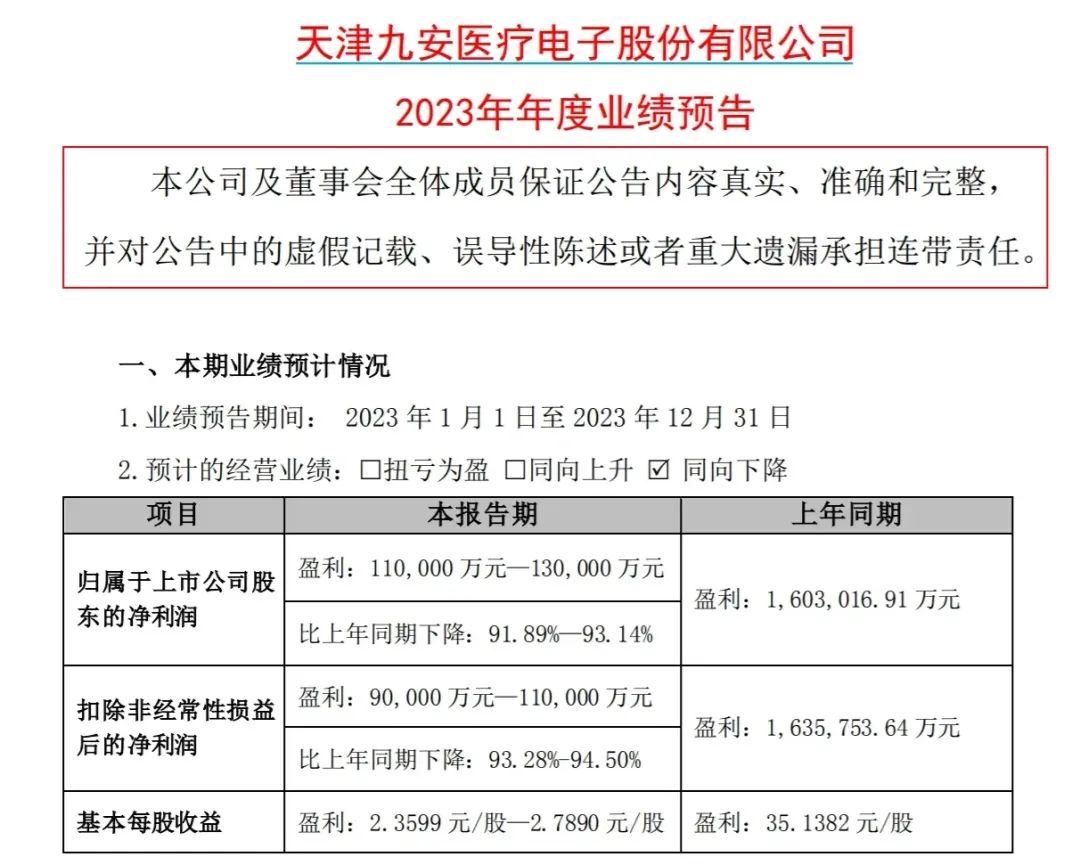 29日晚间,九安医疗披露2023年年度业绩预告,预计2023年归母净利润为11亿元-13亿元,同比下降91.89%-93.14%。而在2022年,九安医疗实现归母净利润160.30亿元。 来源:公司公告九安医疗表示,去年同期,公司iHealth体外诊断检测产品在美国市场畅销,产品销售收入大幅增长带动公司去年同期业绩大幅增长。本报告期业绩较去年同期下降,主要是常态化后,美国市场对于相关产品的需求下降所致。后续,公司将围绕爆款产品和加速推广糖尿病诊疗照护“O+O”新模式在中国、美国的落地两大核心战略布局。值得关注的是,2023年年初以来,九安医疗业绩持续下滑。2023年一季度,该公司实现营业收入14.95亿元,同比下降93.12%;归母净利润为6.01亿元,同比下降95.80%。据九安医疗2023年半年报,公司iHealth系列产品销售收入及利润占比最高,营业收入约为21.44亿元,对比2022年上半年的230.45亿元,同比下降90.7%。