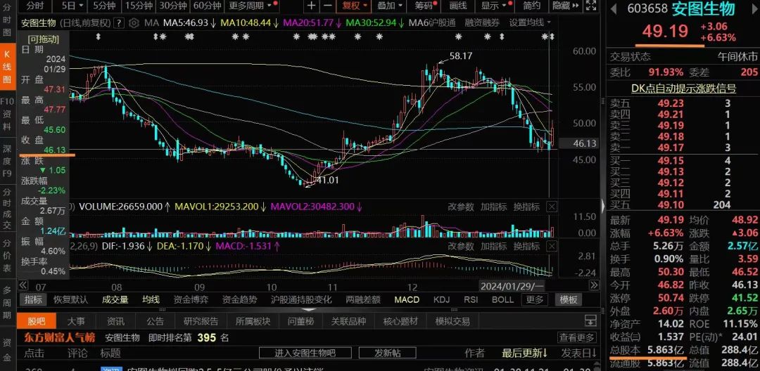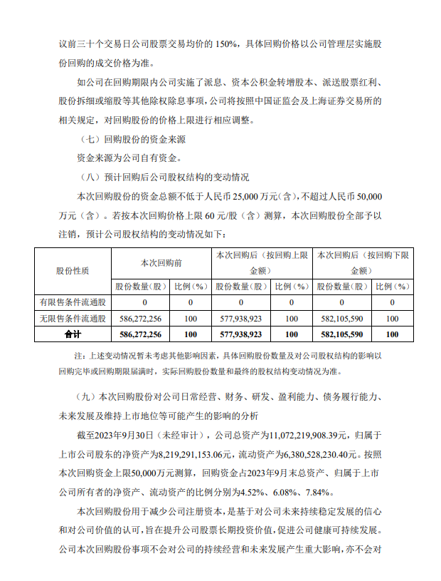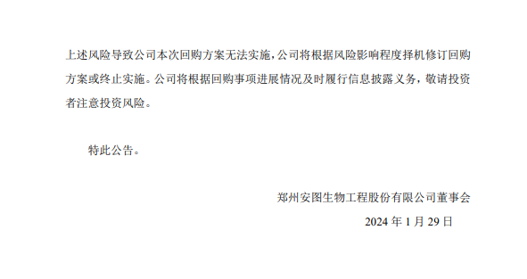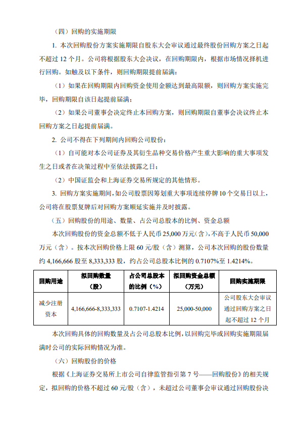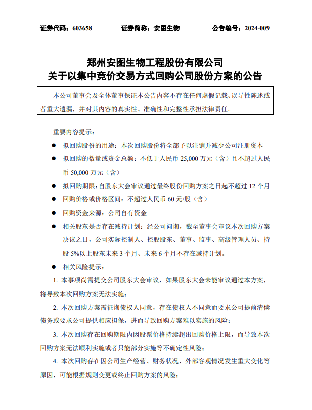 1月29日晚间,安图生物公告称,拟以2.5亿元-5亿元回购股份,全部予以注销并减少公司注册资本,回购价格不超过60元/股。 公司表示,基于对公司未来发展前景的信心和对公司价值的认可,为维护广大投资者的利益,增强投资者信心,综合考虑公司经营情况、财务状况和发展战略,公司拟使用自有资金以集中竞价交易方式回购公司部分社会公众股股份,本次回购股份将依法予以注销并减少公司注册资本。 根据安图生物最新收盘价显示,其半日市值上涨约18个亿!计算公式为(今49.19-昨46.13)*总股本5.863亿=17.94亿元 具体公告内容如下: 来源:东方财富网、安图生物公告、体外诊断网。 |