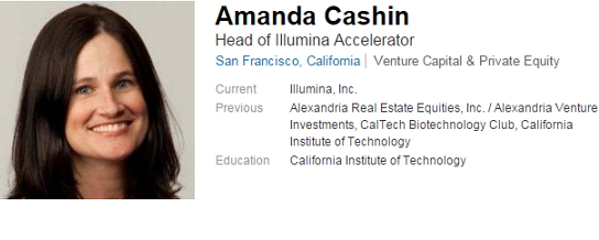 Amanda Cashin Illumina公司创立了世界上首个基因组相关产业加速器,旨在建立创新的基因组产业生态系统。并由Amanda Cashin博士领导,她之前曾是亚历山大房地产公司生命科学部的高级副总裁,并协助领导亚历山大公司风险投资。 Illumina公司高级副总裁和首席技术官Mostafa Ronaghi博士说:“我们最初对加速器项目公司的选择是需要其最有核心竞争力。申请原则是基于它们在医疗保健和农业领域能够提供创新的基因组多样化应用潜力。在Amanda的领导下,Illumina公司及合作伙伴Yuri Milner先生和硅谷银行都表示与这些企业家一起协作,来帮助他们扩大新一代测序市场是一件令人兴奋的事情”。 2014年秋季初创公司专注于以下应用: EncodedGenomics,生物制药公司,考察人类基因组功能元件并结合治疗特性。 EpiBiome,农业科技公司,开发噬菌体组份分析,来预防和治疗奶牛乳腺炎感染。 XcellBiosciences,一家开发生物科学研究工具和诊断公司,专注于商业化其专有的细胞培养液,能够更容易培养来自于患者血液的原发性细胞,包括肿瘤和免疫细胞。 Illumina加速器项目将为选定的创业公司提供种子投资,业务指导,获取Illumina测序系统和试剂, 以及在旧金山湾区足够的实验室空间,为期六个月。