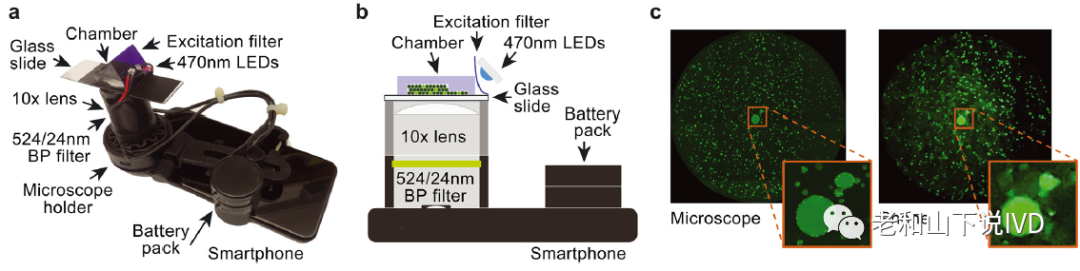 智能手机实现液滴成像和计数 智能手机配备了高灵敏度和高分辨率的摄像头,结合廉价的商用硬件,即可作为便携式的荧光显微镜使用。为了验证这种设备进行液滴定量的可行性,该论文设计了一个安装在智能手机上的光学系统(图4a)。该系统的外接硬件包括用于高分辨率成像的10×目物镜,荧光的激发光源和电源。样品腔室被放置在成像平台上,启动照明,然后由摄像头拍摄图像(图4b)。为了确定该设备的成像效果,将其与实验室荧光显微镜进行了对比。如图4c所示,智能手机图像的质量较差,光背景更高,分辨率总体较低,但尽管如此,阳性液滴仍然可在多层和单分子层区域中被观察到,从而证明了液滴计数的可行性。