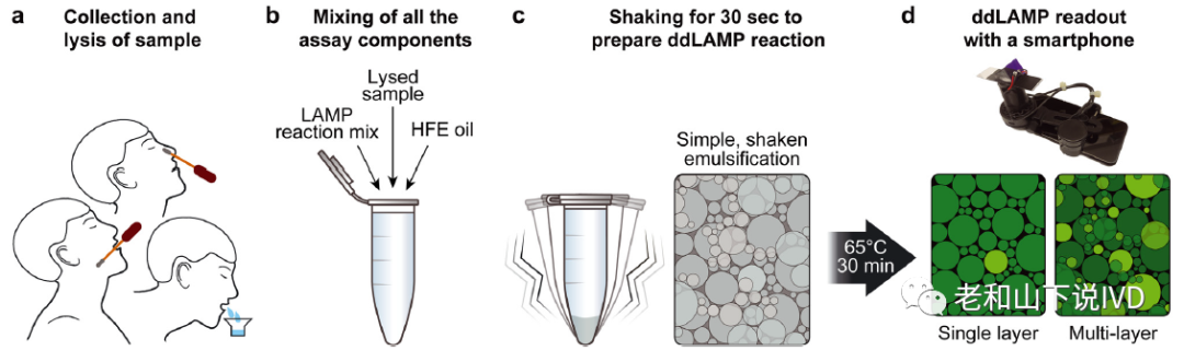 病毒载量的定量检测在临床传染病诊断、传染风险评估、患者治疗监测等领域具有重要的作用。现有的病毒载量检测技术主要包括斑点试验和核酸扩增反应。其中,斑点试验可直观反映病毒载量和活力的相关信息,但步骤繁琐、反应周期长,无法在即时检测中发挥应有的作用。以qPCR为代表的核酸扩增技术,具有定量准确、反应速度快(<2 h)、灵敏度高(~100 CPs/mL)等优势,但却依赖于专业设备与操作,且需要借助标准曲线进行定量检测。相比之下数字液滴PCR(ddPCR)技术可在不需要标准曲线的情况下实现目标病毒的绝对定量,因而在低浓度下准确性更高。然而ddPCR设备复杂,甚至比qPCR更加昂贵,因此应用场景受限于医院或中心实验室。针对上述问题,加利福尼亚大学的Adam R. Abate课题组开发了一种手摇式液滴生成技术,与环介导等温扩增技术(LAMP)相结合,构建了一种操作简便、无需大型仪器的病毒载量即时检测新方法(Shaken digital droplet reverse transcription-LAMP,sdd RT-LAMP),并用于SARS-CoV-2的定量检测。sddRT-LAMP基本检测流程 sddRT-LAMP的基本检测流程如图1所示,首先从患者处采集样本(图1a)并存储于转运缓冲液中,样本可以冷冻保存以供后续分析,或立即进行检测。将待测样本与提取缓冲液混合并裂解5 min,加入RT-LAMP反应预混液和封装油后(图1b),将反应管快速摇晃30 s,以形成多分散的乳化液滴(图1c)。于65 ℃恒温反应30 min,包含目标病毒的阳性液滴将产生显著的荧光信号,而阴性液滴则没有荧光产生。为实现定量检测,该论文中还设计了一种便携式的荧光成像装置,其成像腔室包含一个浅区域(80微米)用于单层成像,一个深区域(190微米)用于多层成像。最终利用智能手机对成像区域进行拍摄分析,即可根据荧光液滴的数量实现对目标病毒载量的即时检测。