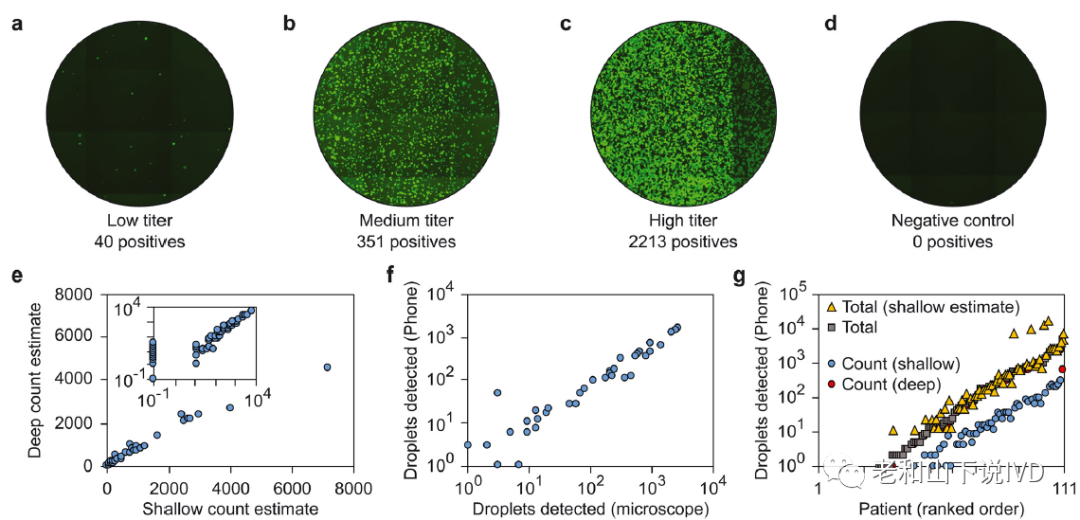 临床应用价值评估 为了验证该装置用于病毒载量即时检测的临床应用价值,该论文分析了2020年至2021年间收集的111个来自于加利福尼亚大学旧金山分校(UCSF)临床微生物学实验室的患者样本。由于Alpha(B.1.1.7)是该时间内主要流行的SARS-CoV-2变异株,因此检测所使用的引物和探针专门针对该变异株设计。利用sddRT-LAMP技术分析了病毒载量在1~5000 CPs/reaction(200~1000000 CPs/mL)范围内的样本,检测结果表明低浓度样本产生了很少的阳性液滴(图5a),而中等和高滴度产生了相应比例的阳性液滴(图5b和c)。阴性对照则未观察到阳性液滴(图5d),反映了该检测体系良好的特异性。双层高成像腔室对于阳性液滴的统计结果证明了该方法在增加动态范围方面的有效性(图5e)。由于智能手机分辨率不如荧光显微镜,且背景较高,它往往会错判或漏判阳性液滴的数量,二者相关性斜率仅为0.56(图5f),但相关系数较高(约0.98)。该结果表明虽然手机检测到的阳性液滴大约只有实际数量的一半,但它能够准确定量样本(图5g)。