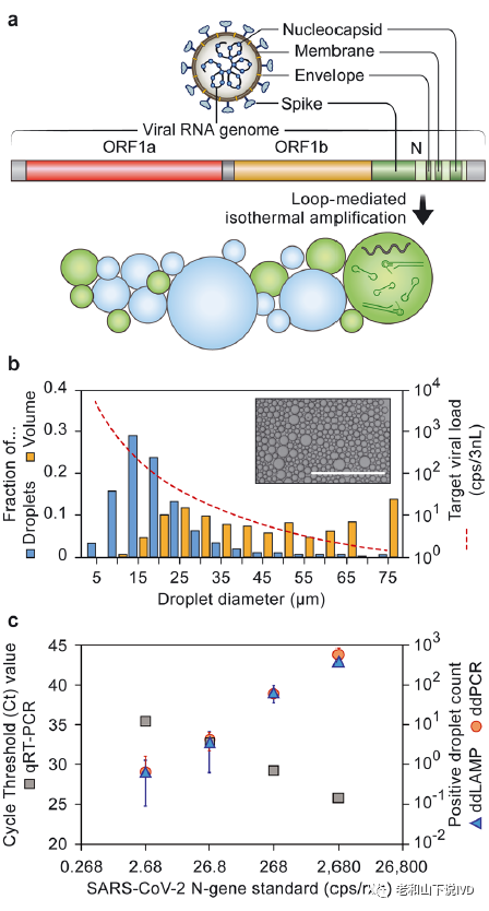摇晃乳化法用于病毒载量定量检测 基于上述检测原理,该论文设计了靶向识别SARS-CoV-2核衣壳蛋白目的基因(图2a)的引物与荧光探针,建立了一种针对于SARS-CoV-2病毒载量的定量检测技术。将待测样品和反应预混液通过手工摇晃约30秒,从而与含有表面活性剂的油乳化,生成pL级别的液滴,其中部分液滴包裹了单个目标分子。所得的多分散乳化液滴的平均粒径约为15微米(图2b,蓝色),因此20 μL的反应体系可生成约1000万个液滴。由于多分散液滴体积与直径的立方关系,大液滴尽管很少见,却包含了相当大的样本体积(图2b,橙色)。但即便液滴是多分散的,≥70%的样本体积被封装在直径≤65微米的液滴中,因此在适当的样本浓度下可以忽略液滴的多分散性来进行病毒载量的评估(图2b,红色虚线)。为了确认摇晃乳化法用于液滴生成的有效性,该论文将sddRT-LAMP技术与qPCR技术进行了比较。将待测样本梯度稀释至2.68~2680 CPs/reaction(536~536000CPs/mL),并用两种方法分别进行了分析,检测结果展现出良好的一致性(图2c)。这些结果表明,sddRT-LAMP具备与qPCR相当的定量准确性,且从便携性上更适用于病毒载量的即时检测。