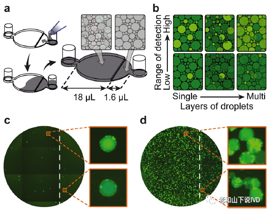便携式成像装置实现更广的动态范围 为了使用液滴计数实现精确的目标定量,该论文开发了一种手持式的成像腔室,其装载方便,能够在单个视野中容纳整个20 μL反应体系,针对病毒载量的动态检测范围覆盖了3个数量级(图3a)。其成像腔室包含一个浅区域(80微米)用于单层成像,一个深区域(190微米)用于多层成像。当病毒浓度较低(<10 CPs)时,阳性液滴很少,因此即使在多层区域中也往往是独立存在的,可以逐个计数(图3c)。而当病毒浓度较高(>100 CPs)时,阳性液滴较为普遍,并且倾向于在多层区域中重叠,不利于定量的准确性。此时浅区域更倾向于形成单液滴层,使其能够清晰得分辨阳性液滴的数量(图3d)。因此,这种双层高成像腔室提供了一种简单的方法,可以在更广泛的靶标浓度范围内获得准确的测量结果。