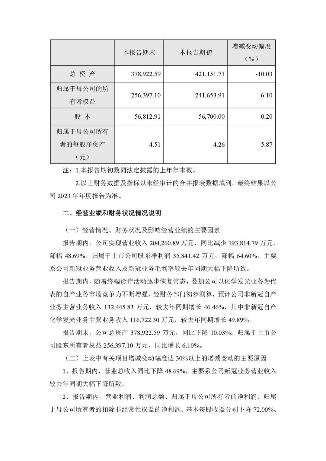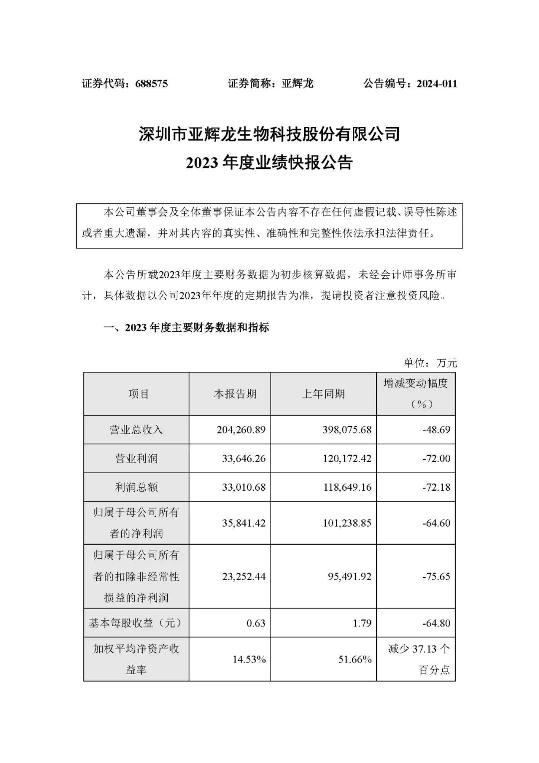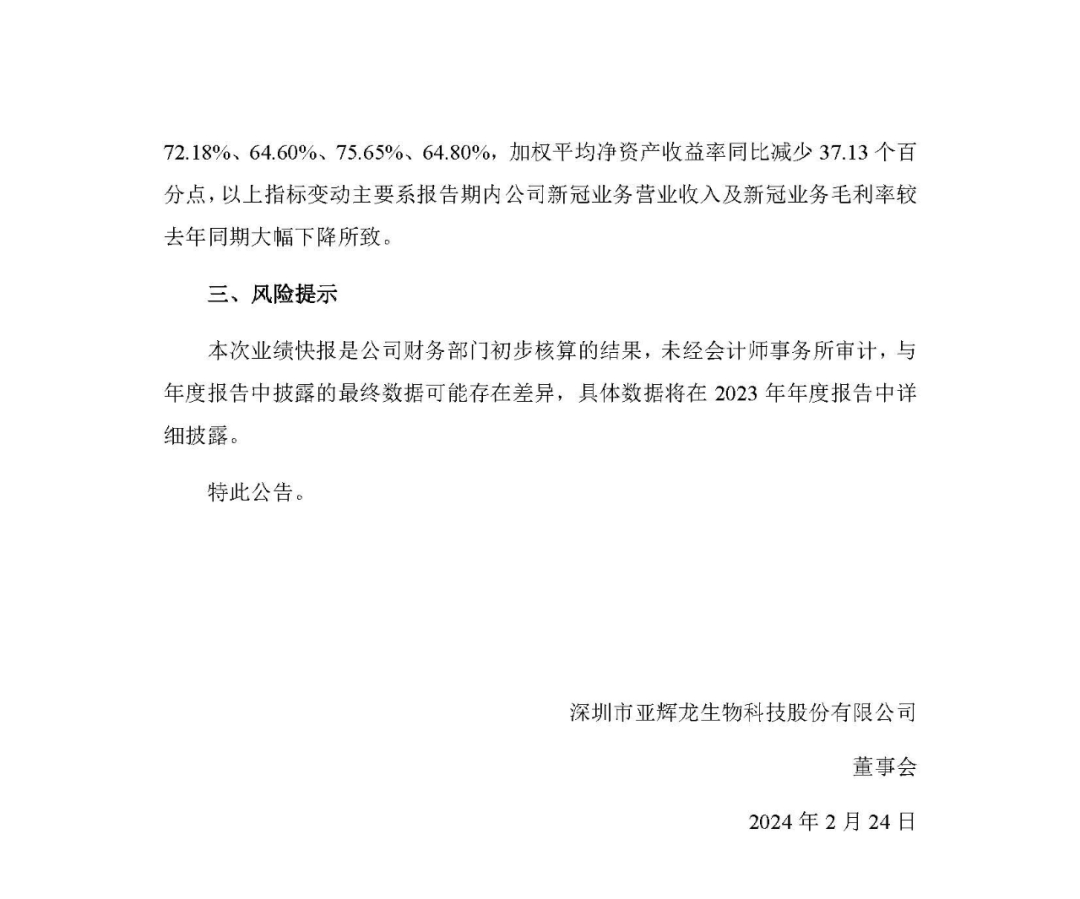 2月23日,亚辉龙发布2023年度业绩快报。报告期内,公司实现营业收入204,260.89万元,同比减少193,814.79万元,降幅48.69%。归属于上市公司股东净利润35,841.42万元,降幅64.60%。主要系公司新冠业务营业收入及新冠业务毛利率较去年同期大幅下降所致。