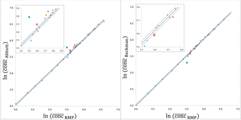 欧盟联合研究中心对胰腺淀粉酶参考物质,进行了互换性的实验。实验方案中,先前对临床样品的选择、参与评估互换性的候选参考物质、以及用哪些常规检测程序进行实验评估等,这些要求在前面几个微信中都已经做了介绍。 本想,因为IFCC工作组的互换性评估方案,对于这个参与互换性评估的这些专家们,是很新颖的。我想他们也正是想确实了解IFCC方案,较美国CLSI的互换性评估方案要好。但是,这篇文章最后的讨论总结,却无法说出究竟哪个方案更好的结论。 欧盟联合研究中心,在为ERM-DA470中铜蓝蛋白丧失了与常规样品间互换性的工作中,已经使用了美国CLSI EP30文件。 图1、2013年欧盟联合研究中心Zeger报告铜蓝蛋白与临床样品间,在多个常规方法检测中互换性的表现。附:图中各个有颜色的为被评估的三个参考物质:红色圆点为1993年制备的ERM-DA470;三角蓝色的为2009年制备的ERM-DA470k;方块绿色的为2010年制备的ERM-DA472。图中的黑线是Deming回归线,黑线上下两条虚线为95%可信水平的预测区间。 图2、α-淀粉酶催化浓度检测,对5个候选RM的互换性评估,按照CLSI C30-A叙述的具有预测区间的线性回归分析。 图1和图2表达的方式相同。评估互换性使用的就是美国CLSI EP30方式。 因此,在EP30的互换性实验方案中,很容易看出,哪个候选参考物质与临床样品在各个检测系统的表现,清楚地说明了问题。