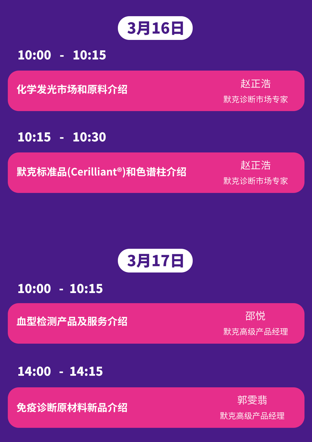 第二十一届中国国际检验医学暨输血仪器试剂博览会(CACLP)将于3月16日至18日在重庆国际博览中心召开。 默克将携Hi-Flow™ Plus硝酸纤维素膜、Estapor®微球等诸多诊断明星产品及大包装定制服务与新老朋友见面,现场还准备了技术干货讲座分享,期待与您现场交流,擦出更多思想与合作的火花! 默克展位 N8-1810 *最终安排请以现场当天为准 3月16日13:00-15:00 默克侧向层析专题卫星会 ——聚全球智慧,推动POCT高质量发展 地点:展馆二楼M202会议室(N1正上空) 悄悄告诉你:本次卫星会还邀请到默克诊断全球技术大咖重磅加盟,敬请期待! 扫码预报名 现场签到领好礼 扫码预报名,现场到N8-1810展台一键签到即可领取精美好礼一份,多种礼品任君挑选,先到先得。 *以下礼品仅作参考,以展会现场剩余库存情况为准 甄选星品 ✦ + + 针对侧向层析技术专门优化,默克Hi-Flow™ Plus硝酸纤维素膜按照最严格的标准制造,提供无与伦比的表面质量。Hi-Flow™ Plus硝酸纤维素膜可提供优秀的均一性,稳定的批间差,保障一致的检测结果,极低的非特异性背景信号。 ✦ + + Estapor®品牌已面向IVD厂商化学发光、侧向层析、乳胶比浊等平台供货超35年之久,性能成熟、久经考验,深受客户一致好评。该产品被国际知名品牌广泛用于全球数百万项检测中,同时兼容手动和自动平台,高度可表征、可定制且可提供关键功能性设计,完美匹配IVD厂商需求。 • 磁化强度高:微球磁性分离和迁移速度快,其磁化程度不会随时间变化或降低。既不存在磁滞,也不存在磁化残留。 • 重现性好:采用聚苯乙烯材料,具有刚性、尺寸稳定、粒径均匀、批次间重现性等优点。 • 供应可靠:先进的制造设施可满足从克级到工业级(kg)规模的生产需求,供货稳定可靠。 • 背景和非特异性结合低:退磁后易于分散,实现高效洗涤,降低背景和非特异性结合。 ✦ + + 作为全球著名的化学和标准物质供应商,我们完美结合默克与Sigma-Aldrich® 卓越的创新与技术能力、全面的产品与服务,一直致力于为分析化学界稳定提供全方位、精准及质量保证的产品。原Sigma-Aldrich® ,Cerilliant®等品牌分析标准品,均已并入默克Supelco®分析品牌旗下。总计标准物质超20,000种,且每年新增约1,000种。 Cerilliant® 有近50年的标准物质生产经验,是全美第一家被授予ISO 17034有机标准物质认证的生产商。90%+ 的内标均自己合成开发,广泛的产品线从滥用药物到药品,及其代谢物、杂质和同位素标记物。 • 生产和检测均经过ISO 17034 和ISO 17025认证 • 使用经验证过的分析方法 • 分析证书内容详尽,含不确定度和溯源性 ✦ + + 默克Supelco® HPLC/UHPLC色谱柱产品线,由业内最具竞争力的原默克和原Sigma-Aldrich两大液相柱家族强强联手。集合熔融核、整体硅胶、超纯硅胶颗粒以及聚合物等填料技术,经典的Discovery®、Ascentis®、SeQuant® 和Purospher™STAR系列色谱柱一直深受用户信赖。基于熔融核颗粒技术的Ascentis® Express系列色谱柱,效率比同粒径全多孔颗粒高40%,同等压力下速度高达亚 2 μm颗粒两倍,提高样品通量和分离度,适用于所有HPLC /UHPLC 系统。固定相种类丰富,方便优化方法,为您的分析工作如虎添翼。 ✦ + + • 专注血型检测领域30年 • BIOSCOT® 品质卓越,享誉国际 • 符合FDA权威审核标准,拥有ISO9001、ISO 13485质量认证 • 全球最大的人lgM单克隆抗体生产基地 • 多种试剂类型供您选择:抗体中间体,以及配套稀释剂 • 成品试剂获CE 认证 • 可提供定制化服务 |