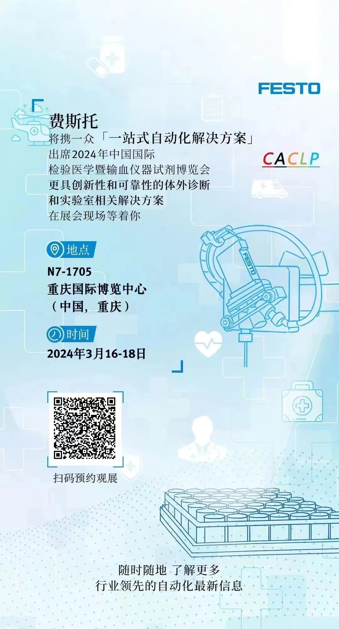 一场与医疗行业实验室自动化相关的盛会即将到来!2024 年 3 月 16 日至 18 日,第二十一届中国国际检验医学暨输血仪器试剂博览会(CACLP)将在重庆国际博览中心盛大启幕。 作为 CACLP 的参展商,Festo 将携带多项新产品和应用亮相,与业界共同探讨实验室自动化和医疗技术的前沿解决方案,分享最新的研究成果和经验。这些新产品和应用究竟有哪些应用亮点?我们提前揭秘! Festo 为本次展会特别研发的高通量智能移液系统将样本上样、样本信息识别、自动关盖、精确移液以及自动关盖等功能融为一体,实现全程自动化。 1 无接触操作: 告别手动操作,保持无菌和无污染的环境; 2 高效工作流程: 优化操作流程,提高了工作效率,缩短了周转时间; 3 无误差的精度: 内置精确移液技术保证样本处理的准确性与一致性,让结果更可靠; 3 增强通量: 系统具有高通量的能力,可以快速处理大量样本; 3 无缝集成: 设计用于与现有实验室设置无缝集成,满足各种研究和诊断需求; 作为 Festo 在气体控制、液体控制和电驱动领域的黄金伙伴联合应用的杰出典范,这一方案融合了三款经典产品:滴定头 DHOE、正负压发生器 PGVA 和旋转抓取模组 EHMD,为实验室提供了完整的一体化解决方案。 在生命科学行业,液体搬运和开关盖转运是必不可少的操作,Festo 紧凑型门架 EXCL 系统对此提供了完美的解决方案。涵盖紧凑型门架、VYKA 介质阀组、旋转抓手模组等组件的完美组合,拥有独到优势: 1 EXCL 门架 EXCL 门架结构紧凑小巧,可方便地集成到桌面系统中,适用于自动化分析流程中的各种操作; 2 VYKA 介质阀组 VYKA 介质阀组通过与 PGVA 及 VAEM 的配合,实现了 ul 级滴定,为试剂分配提供了高效解决方案; 3 旋转抓手模组 EHMD-50 旋转抓手模组 EHMD-50 具备多种控制模式,适用于样本管开关盖、小零件搬运及深孔板转运等多种应用场景。 除此之外 还有微孔板洗板机及呼吸气体控制模块 等更多产品与应用亮点 即将在 N7-1705 展台展出! 届时期待“渝”您相约 一同探索实验室自动化与医疗技术定制化的 更多可能 |