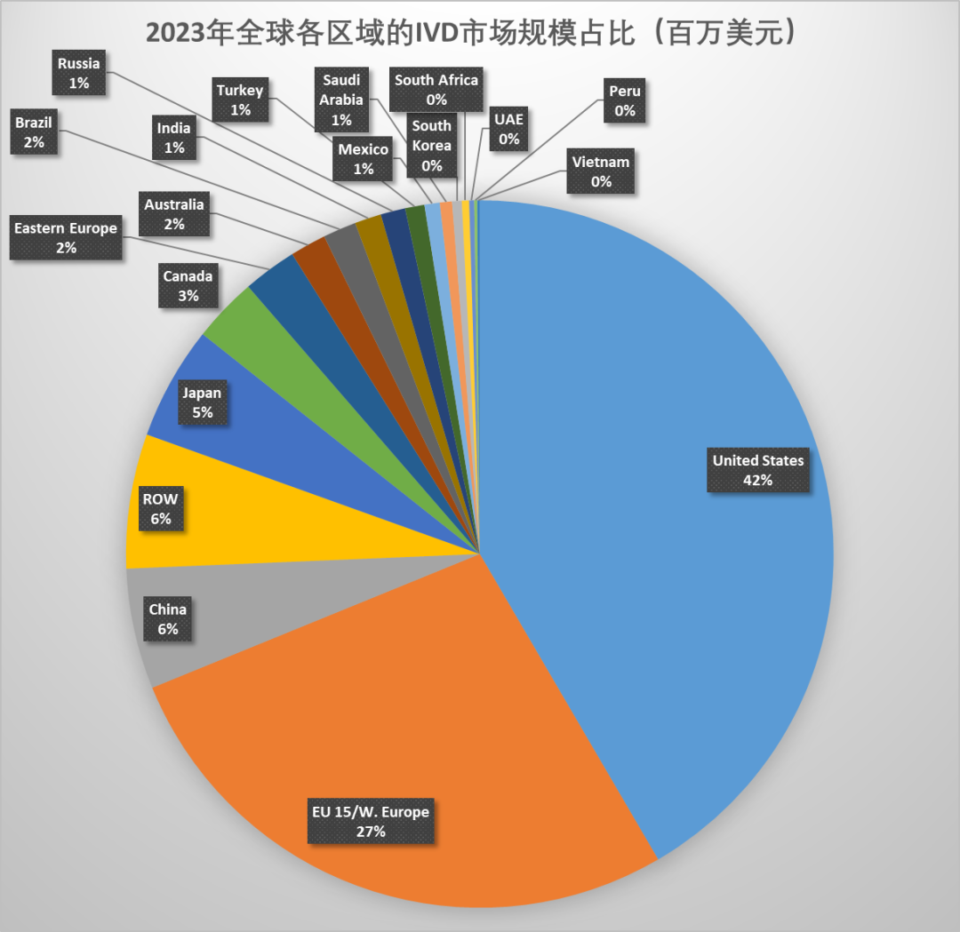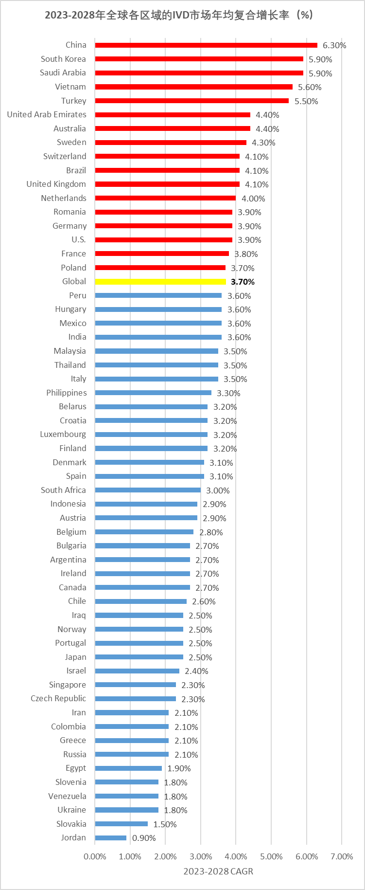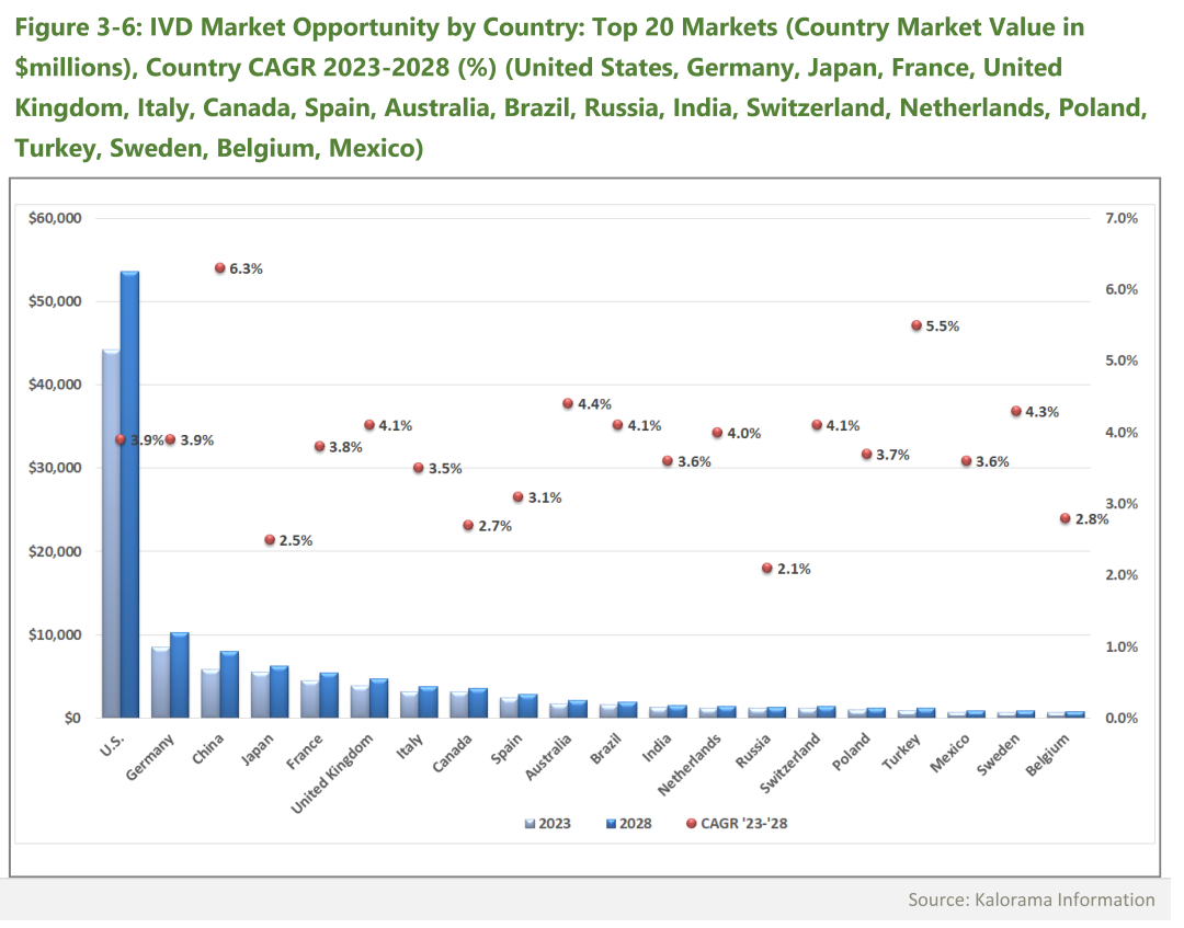 据Kalorama Information发布的《The Worldwide Market for In Vitro Diagnostic Tests, 16th Edition 》(2023年8月)报告,2023年全球IVD市场规模最大的依然是美国,约占全球IVD市场规模的42%;欧洲地区约占27%,排第二;中国的IVD市场规模约占6%,排名第三,日本、加拿大次之。 据报告显示,从2023-2028年全球各区域的IVD市场年均复合增长率来看,高于全球IVD市场的3.7%的地区共有17个。中国的年均复合增长率为6.3%,排名最高,韩国和沙特阿拉伯均为5.9%,越南为5.6%,土耳其为5.5%,其它国家的IVD年均增长如下图。据报告称,综合市场规模和年复合增长率来看,全球IVD市场中最有机遇的前二十个地区如下:此外,据报告称将对中国、巴西、印度、墨西哥、波兰、罗马尼亚、沙特阿拉伯、韩国、土耳其和越南这10个新兴市场最感兴趣。