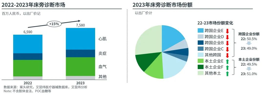 2022-2023年床旁诊断市场受疫情后急诊患者增加驱动下,整体增速高达15%;本土企业在床旁心肌检测高速增长驱动下快速占据市场份额