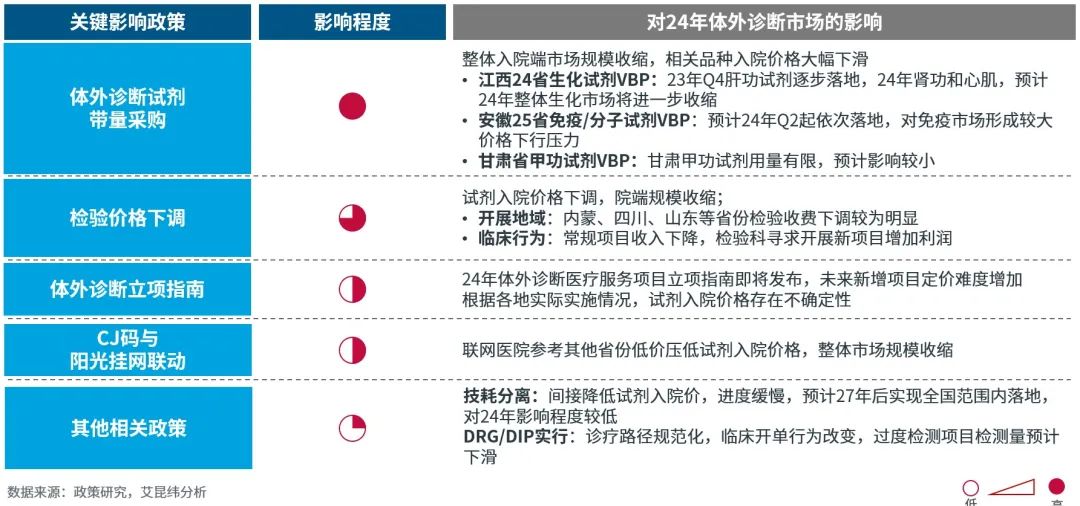 通过分析重点政策,IQVIA预计2024年试剂入院价格将受到政策影响的明显冲击,其中江西及安徽省联盟集采与检验价格下调所产生的影响最大。
