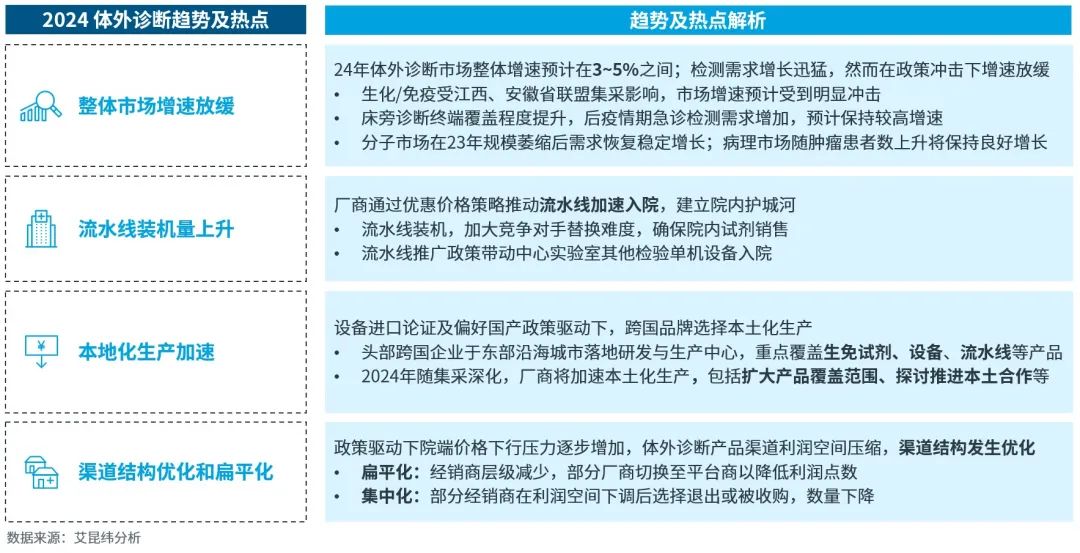 试剂集采、国产替代、医疗服务项目立项指南等政策因素预计将放缓2024年市场增速,加速渠道结构优化。流水线入院建立院内试剂护城河、本土化生产提速、产品线创新等方式将成为驱动体外诊断企业发展的核心竞争力,助力企业在后集采时代的持续增长。