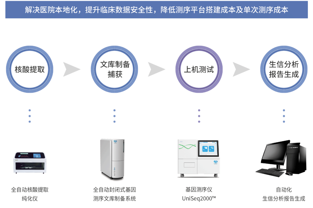 全球感染性疾病发病率不断上升,病原体呈现多样化和复杂化的发展趋势,感染成为急危重症患者死亡的主要原因之一。病原微生物的准确检测、快速鉴定是精准诊断感染性疾病的先决条件和确定治疗策略的关键点。病原靶向测序(targeted NGS, tNGS)检测技术以价格和多靶标的独特优势在感染领域异军突起。 为解决临床病原检测精准度、效率以及成本问题,铭毅智造基于自主研发的单色荧光基因测序仪UniSeq2000,倾心推出从仪器、诊断试剂、检测报告,到技术支持等一站式全流程tNGS整体解决方案。该方案可真正实现病原微生物检测本地化,提升临床数据安全性,降低测序平台搭建成本和单次测序成本,助力目标病原的快速、准确、敏感检测。 tNGS整体解决方案产品亮点 该整合方案中,在提取、建库、测序、分析全流程环节,均配备自动化设备,极大降低操作难度和人工成本 整体解决方案输出,方便本地化实验室直接引入,降低搭建成本。测序平台通量灵活,根据样本量调整测序模式 从操作培训到售前售中售后问题,解决铭毅智造提供专业的全流程技术支持服务 检测范围涵盖呼吸系统常见重要病原体、较强致病性的真菌和非典型病原体,以及部分寄生虫。 多学科专家团队建库检测范围,适用性广泛 检测范围: 适用场景&科室: 独特的样本前处理技术 对于难提取真菌和细菌优化形成独特的破壁方案;针对RNA病毒的特点,设计针对性提取策略。最大程度提高各类型病原微生物的提取效率。 多靶标扩增引物设计 高包容性引物设计:综合微生物系统学和医学划分标准,引物覆盖种内代表性菌株,有效降低漏检风险; 高拷贝数靶标、多对引物设计:选取高拷贝数靶标,引入多对引物扩增方案,提高检测精准度,降低人源及背景菌群基因组干扰,辅助排除环境污染。 “全自动封闭式基因测序文库制备系统” ELPS系统,将流程复杂的文库制备集成到一站,把“样本进,产物出”的全自动化基因检测理念真正落地。