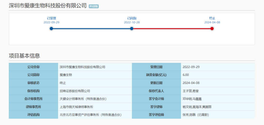 4月9日,上交所官网显示,深圳市爱康生物科技股份有限公司科创板IPO已终止。
