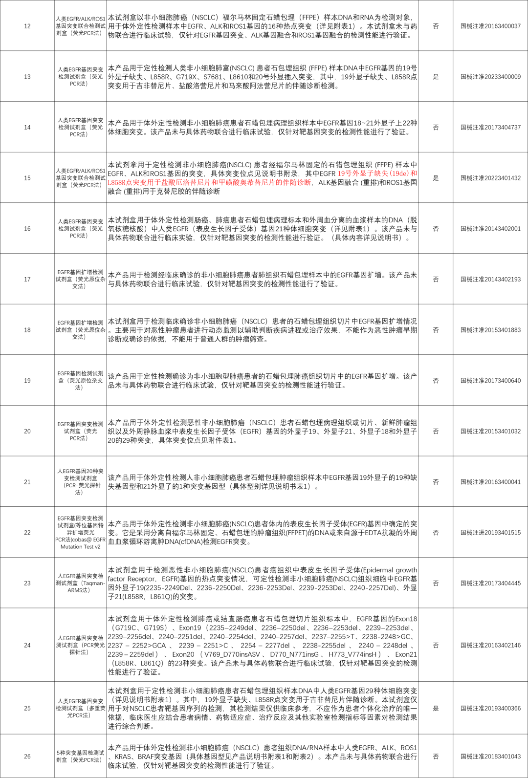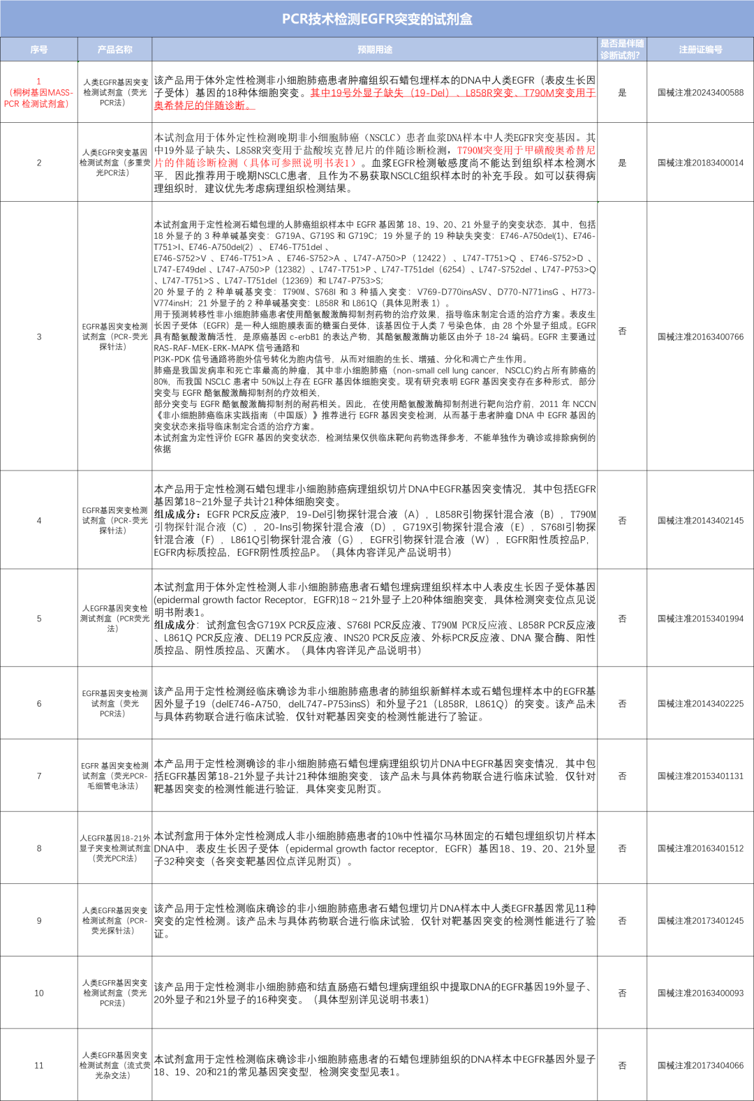 目前已经获得国家药监局获批的使用PCR技术检测EGFR突变的试剂盒共有26款,但是其中,可以用作伴随诊断用途的仅有5款试剂盒!其中,桐树基因MASS-PCR法是唯一19Del、L8585R、T790M全部获批奥希替尼伴随诊断(所有非小细胞肺癌)的检测试剂盒。