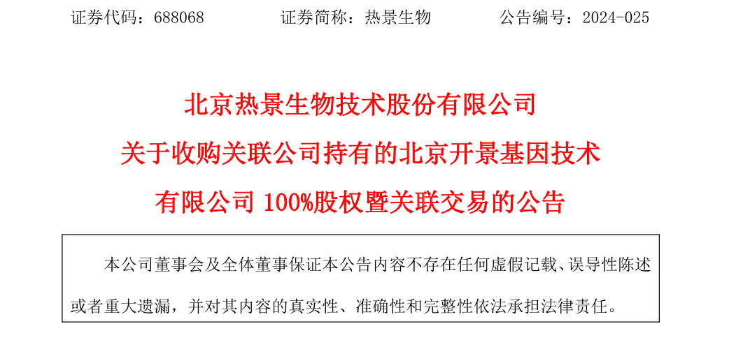 4月15日晚间,热景生物(688068)发布公告称,为整合公司及关联公司体外诊断业务,公司拟收购关联公司舜景医药持有的开景基因100%的股权。本次交易的转让价款为1100万元,全部以现金方式支付。本次交易可使得公司完全具备从体外诊断上游关键生物活性原料到体外诊断试剂及仪器研发、生产、销售的全产业链业务。 开景基因成立于2016年,是专业从事体外诊断试剂原料研发、生产及销售于一体的生物技术服务公司。热景生物表示,本次交易可优化公司业务结构,有助于统一整合公司及关联公司体外诊断业务,使得公司完全具备从体外诊断上游关键生物活性原料到体外诊断试剂及仪器研发、生产、销售的全产业链业务,有助于公司进一步聚焦发展主业,符合公司实际经营和稳健发展需要。 |