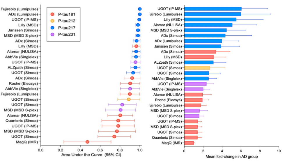 有意思的是,由Global Biomarker Standardization Consortium(全球生物标志物标准化联合会)发起的一次研究,对11家不同制造商的多种ptau-217测定进行了比较。尽管该实验样本量较小,但是发现p-tau217比p-tau181和p-tau231的AUC更高。这也让业内各路专家感觉到欣慰,因为这表明有多个比较靠谱的p-tau217血浆检测。