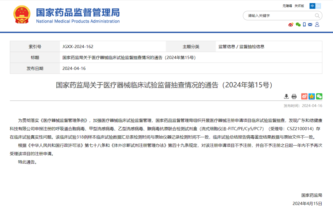 近日,国家药品监督管理局组织开展医疗器械注册申请项目临床试验监督抽查,发现广东和信健康科技有限公司申报注册的呼吸道合胞病毒、甲型流感病毒、乙型流感病毒、腺病毒抗原联合检测试剂盒(流式细胞仪法-FITC/PE/Cy5/PC7)(受理号:CSZ2100014)存在临床试验真实性问题。该临床试验318例样本临床试验数据汇总表检测时间与原始仪器记录检测时间不一致,临床试验总结报告病毒鉴定结果数据与原始文件不一致。 根据《中华人民共和国行政许可法》第七十八条和《体外诊断试剂注册管理办法》第四十九条规定,对该注册申请项目不予注册,并自不予注册之日起一年内不予再次受理该项目的注册申请。 |