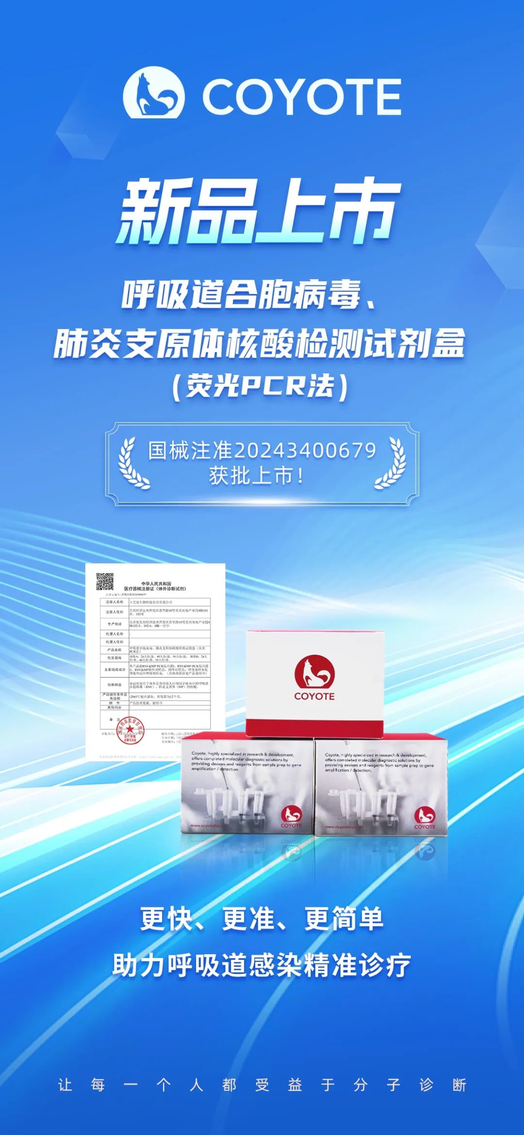 重磅上市! 近日,卡尤迪生物研发的呼吸道合胞病毒、肺炎支原体核酸检测试剂盒(荧光PCR法)(简称“RSV&MP双联检试剂盒”)获得国家药品监督管理局(NMPA)第Ⅲ类医疗器械注册证(国械注准20243400679)。 卡尤迪RSV&MP双联检试剂盒,30分钟完成呼吸道合胞病毒与肺炎支原体鉴别诊断,为临床精准用药提供有力支撑。 产品优势