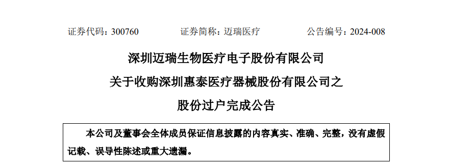 2024 年 4 月 15 日,深圳迈瑞医疗发布公告,正式完成对惠泰医疗的过户登记。据悉其收到中国证券登记结算有限责任公司出具的《证券过户登记确认书》,其协议转让涉及的惠泰医疗 21.12%的股份已过户登记至深迈控名下。截至本公告日,深迈控直接持有惠泰医疗 14,120,310 股股份,通过其一致行动人珠海彤昇合计持有 2,335,296 股股份,合计持有 16,455,606 股股份,占惠泰医疗总股本的 24.61%。