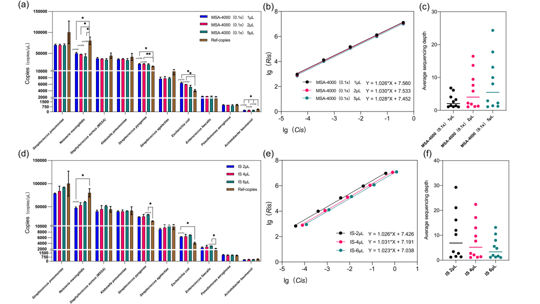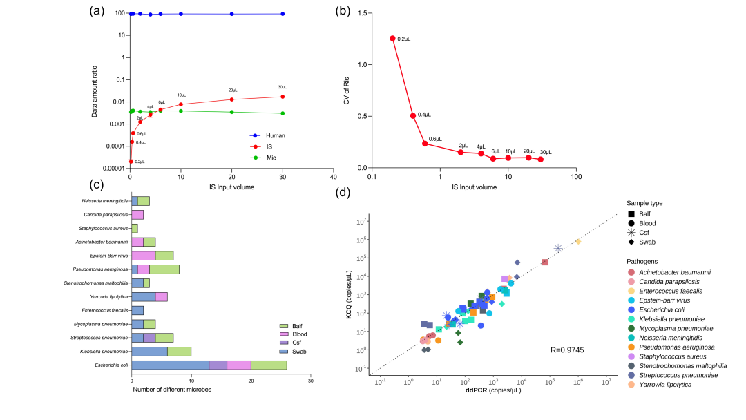 在临床比对测试前,为确定临床样本中合适的内标投入量,研究人员对0.2µL-30µL的IS投入量进行了梯度测试,结果表明投入量若大于4µL则会抢占微生物测序数据量,投入量若低于2µL则IS各梯度检出稳定性(Cv)较差,因此临床测试中选用2µL投入量作为标准。在临床测试中本研究评估了血液、拭子、肺泡灌洗液、脑脊液等36例临床样本(image.6c),共检出477个微生物靶标,其中83个微生物靶标经过ddPCR的定量(image.6d)作为比较。