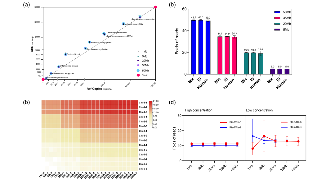 本研究介绍了一种能对临床样本病原微生物绝对定量的方法。其原理在于引入15条人工合成的dsDNA,每三个一组为一个浓度梯度,共五个浓度梯度混合作为测序时的内参,并将其命名为Internal-Standard(IS),IS通过与样本共测序,并利用自研的数学模型与分析系统可对微生物进行拷贝数定量,这项技术在文章中也被命名为KingCreate-Quantification (KCQ)。