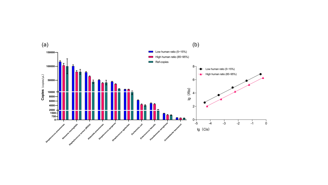 在常见的临床样本中,来自宿主的核酸比例往往占到了98%以上,只有不到2%的数据来自于病原微生物。因此,研究人员使用human leukemia T cells 作为人源DNA进行了模拟实验。结果表明高宿主背景与低宿主背景下KCQ的定量结果无显著性差异(image.4a)。通过对回归曲线进行的分析发现,高宿主比例与低宿主比例对IS回归曲线的影响主要在截距(所占数据量),对斜率无明显影响(image4b),因此定量结果不会出现较大波动。
