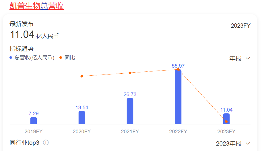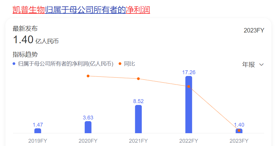 凯普生物4月24日披露2023年年报2023年公司实现营业总收入11.04亿元同比下降80.27%归母净利润1.40亿元同比下降91.86%扣非净利润1.13亿元同比下降93.47%经营活动产生的现金流量净额为3.20亿元同比下降75.59%。