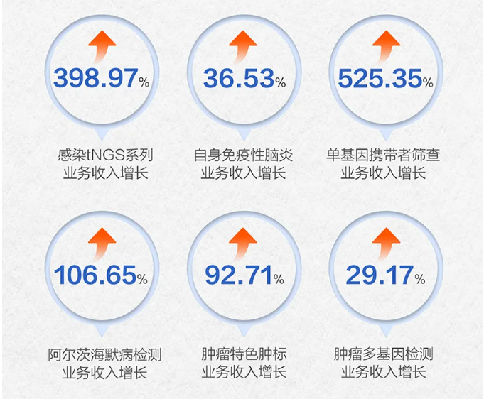 从项目上来看,金域有两个爆款产品的增长非常引人瞩目,一个是感染tNGS系列的业务增长,达到了398.97%,而一个则是单基因携带者筛查业务收入增长,达到了525.35%。