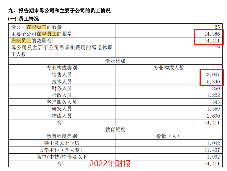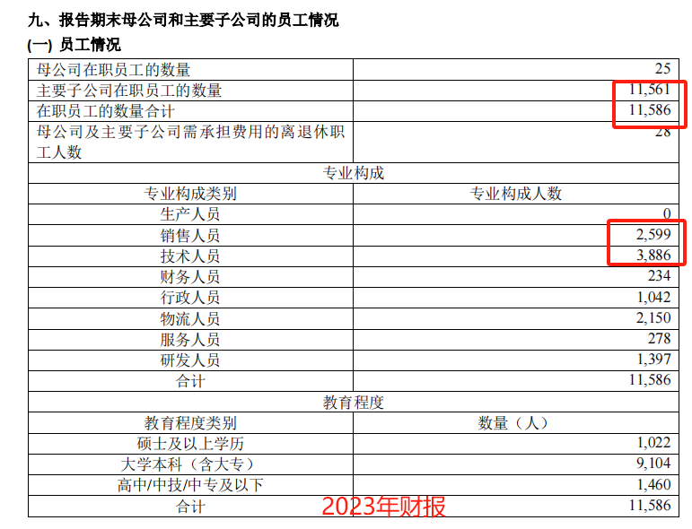 从员工人数变化上来看,2023年金域医学减员2800余人,对比2022年的数据来看,主要是销售人员和技术人员的大幅缩减。