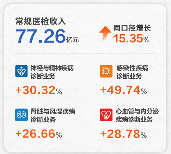 金域医学常规医检收入77.26亿元,同口径增长15.35%,其中感染性疾病诊断业务增长幅度最大,达到了49.74%。