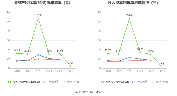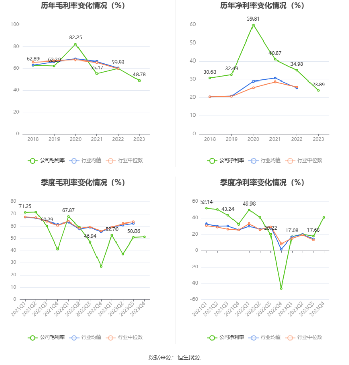 奥泰生物表示,2020年至2022年,公司经营业绩大幅增长主要来源于新冠检测产品销售相关业务的突发增长,未来公司的整体经营业绩与新冠疫情期间相比面临销售业绩大幅度下滑的风险。 分产品来看,2023年公司主营业务中,传染病类收入2.75亿元,占营业收入的36.48%;毒品及药物滥用类收入2.04亿元,占营业收入的27.00%;新冠检测类收入0.89亿元,占营业收入的11.80%。 以4月26日收盘价计算,奥泰生物目前市盈率(TTM)约为32.93倍,市净率(LF)约为1.55倍,市销率(TTM)约为7.88倍。 公司近年市盈率(TTM)、市净率(LF)、市销率(TTM)历史分位图如下所示: 数据统计显示,奥泰生物近三年营业总收入复合增长率为-12.73%,在体外诊断行业已披露2023年数据的29家公司中排名第23。近三年净利润复合年增长率为-35.70%,排名20/29。 截至2023年末,公司员工总数为1093人,2022年员工总数为1244人,减员151人,2023年人均创收69.05万元,人均创利16.52万元,人均薪酬15.53万元,较上年同期分别下降74.65%、82.66%、0.80%。 2023年,公司毛利率为48.78%,同比下降11.15个百分点;净利率为23.89%,较上年同期下降11.09个百分点。从单季度指标来看,2023年第四季度公司毛利率为51.28%,同比上升24.16个百分点,环比上升0.42个百分点;净利率为40.58%,较上年同期上升86.89个百分点,较上一季度上升22.90个百分点。 分产品看,传染病类、毒品及药物滥用类、新冠检测类2023年毛利率分别为45.35%、61.13%、54.81%。 报告期内,公司前五大客户合计销售金额1.46亿元,占总销售金额比例为19.38%,公司前五名供应商合计采购金额0.48亿元,占年度采购总额比例为29.24%。 数据显示,2023年公司加权平均净资产收益率为4.52%,较上年同期下降27.12个百分点。公司2023年投入资本回报率为3.68%,较上年同期下降26.89个百分点。 2023年,公司经营活动现金流净额为2476.37万元,同比下降98.18%;筹资活动现金流净额-5.59亿元,同比减少1.97亿元;投资活动现金流净额-1.41亿元,上年同期为-12.64亿元。 进一步统计发现,2023年公司自由现金流为-2.16亿元,上年同期为0.35亿元。 2023年,公司营业收入现金比为103.30%,净现比为13.71%。 营运能力方面,2023年,公司公司总资产周转率为0.17次,上年同期为0.78次(2022年行业平均值为0.60次,公司位居同行业13/38);固定资产周转率为3.02次,上年同期为19.41次(2022年行业平均值为5.40次,公司位居同行业4/38);公司应收账款周转率、存货周转率分别为6.30次、2.02次。 2023年,公司期间费用为1.99亿元,较上年同期减少1.66亿元;但期间费用率为26.30%,较上年同期上升15.54个百分点。其中,销售费用同比下降53.91%,管理费用同比下降14.7%,研发费用同比下降41.55%,财务费用由去年同期的-7092.70万元变为-5853.55万元。 资产重大变化方面,截至2023年年末,公司在建工程较上年末增加1054.30%,占公司总资产比重上升10.96个百分点;货币资金较上年末减少33.52%,占公司总资产比重下降10.20个百分点;交易性金融资产较上年末减少19.72%,占公司总资产比重下降3.29个百分点;其他流动资产较上年末增加536.78%,占公司总资产比重上升1.29个百分点。 负债重大变化方面,截至2023年年末,公司合同负债较上年末减少71.73%,占公司总资产比重下降2.13个百分点;应付账款较上年末减少54.66%,占公司总资产比重下降1.76个百分点;应交税费较上年末减少23.54%,占公司总资产比重下降0.29个百分点;其他流动负债较上年末减少98.58%,占公司总资产比重下降0.24个百分点。 从存货变动来看,截至2023年年末,公司存货账面价值为1.89亿元,占净资产的4.93%,较上年末减少506.51万元。其中,存货跌价准备为5357.36万元,计提比例为22.F。 2023年全年,公司研发投入金额为1.21亿元,同比下降41.55%;研发投入占营业收入比例为16.06%,相比上年同期上升9.94个百分点。 年报称,2023年度,公司新增授权专利/软件著作权共37项,其中发明专利1项,实用新型专利18项,外观设计专利16项,软件著作权2项。截至2023年底,公司累计获得授权专利/软件著作权158项,其中发明专利29项、实用新型专利65项、外观设计专利60项和软件著作权4项。 在偿债能力方面,公司2023年年末资产负债率为6.91%,相比上年末下降4.26个百分点;有息资产负债率为0.39%,相比上年末上升0.21个百分点。 2023年,公司流动比率为11.53,速动比率为10.84。 年报显示,2023年年末公司十大流通股东中,新进股东为上证红利交易型开放式指数证券投资基金、国泰致远优势混合型证券投资基金、招商银行(34.480, 0.08, 0.23%)股份有限公司-国泰价值优选灵活配置混合型证券投资基金(LOF)、香港中央结算有限公司,取代了三季度末的国泰佳泰价值平衡股票型养老金产品-中国建设银行(7.120, -0.12, -1.66%)股份有限公司、姜正金、宓莉、国泰医药健康股票型证券投资基金。在具体持股比例上,宁波文叶创业投资合伙企业(普通合伙)、国泰江源优势精选灵活配置混合型证券投资基金持股有所上升。 筹码集中度方面,截至2023年年末,公司股东总户数为5949户,较三季度末下降了1647户,降幅21.68%;户均持股市值由三季度末的64.39万元上升至91.42万元,增幅为41.98%。 指标注解: 市盈率=总市值/净利润。当公司亏损时市盈率为负,此时用市盈率估值没有实际意义,往往用市净率或市销率做参考。 市净率=总市值/净资产。市净率估值法多用于盈利波动较大而净资产相对稳定的公司。 市销率=总市值/营业收入。市销率估值法通常用于亏损或微利的成长型