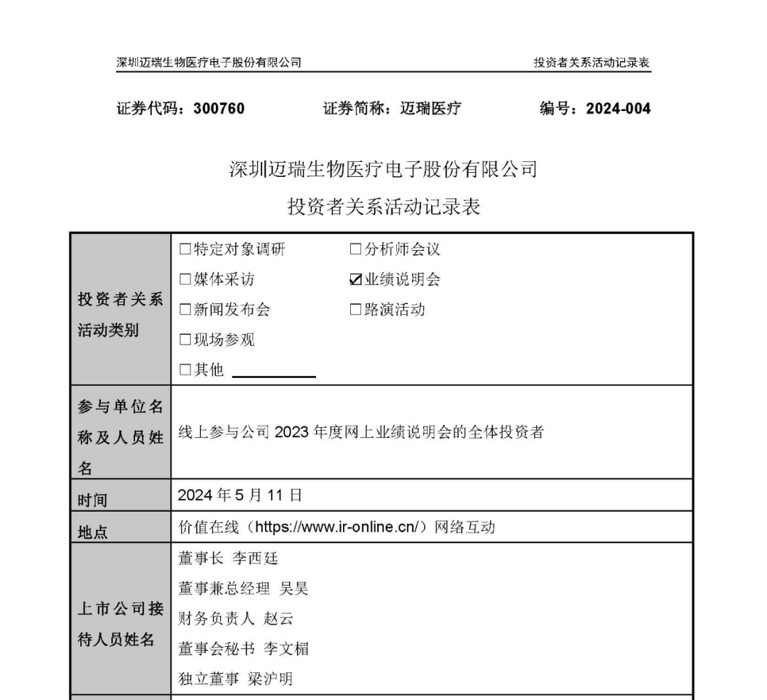 迈瑞医疗于2024年5月11日发布投资者关系活动记录表,回答了投资者关心的问题。迈瑞董事长李西廷、董事兼总经理吴昊、财务负责人赵云、董事会秘书李文楣、独立董事梁沪明接待。 问:请问迈瑞对标的全球竞争对手是谁?目前迈瑞和对方的差距主要在哪方面?公司预计需要多久赶超竞争对手? 答:作为全球前五十医疗器械榜单中唯一一家总部位于发展中国家的公司,迈瑞选择了一条和欧美日公司截然不同的成长道路。从监护仪、血球、超声等业务开始布局,迈瑞目前已经建立了生命信息与支持、体外诊断、医学影像三大业务线,并在微创外科、心血管等领域持续扩大布局力度,逐渐成为向医疗机构提供医疗设备、体外诊断试剂、高值耗材等整体数智化解决方案的供应商,未来还将继续横向拓展更多的新业务领域。 目前,迈瑞的监护仪、麻醉机、呼吸机、除颤仪、血球、超声等成熟业务在全球范围已经实现了技术引领,并且这些业务在全球的市场占有率也已实现市场前三的地位,其中超声首次实现全球第三。但我们也清醒地意识到,未来成长空间巨大的化学发光、微创外科、心血管等高增长潜力业务的技术创新能力目前相较进口品牌仍存在一定差距,迈瑞将继续在这些领域倾斜研发资源,不断寻求技术创新突破,争取早日在这些领域也实现技术引领。 问:《关于加强重症医学服务能力建设的意见》文件要求提高ICU床位,请问这对公司是否有积极的意义?公司的哪些产品和服务可以应用到ICU建设? 答:《关于加强重症医学服务能力建设的意见》指出,加强重症医学医疗服务能力建设,是健康中国建设和卫生健康事业高质量发展的重要内容,是构建优质高效的医疗卫生服务体系、重大突发事件救治体系的重要举措,对于维护人民生命安全和身体健康具有重要意义。 当前,国内人均ICU床位数与欧美发达国家相比还存在明显差距,专科ICU 病房建设正方兴未艾,未来市场发展潜力巨大。迈瑞能够提供相对完整的ICU 产品解决方案,在ICU科室中涉及的主要产品如监护仪、呼吸机、输注泵、除颤仪、吊桥、POC超声等具备较强的产品竞争力。除此以外,公司推出的“瑞智联”IT解决方案能够帮助医院实现一系列重症设备的互联互通,对于提升设备的使用效率、减少医护人员的感染风险和繁重劳动、实现医生的远程诊疗等方面有着重要意义。未来,公司还将加大重症学科的临床信息系统的投入,通过AI的方式最大程度赋能 ICU 病房实现智慧诊疗,为临床带来更大的价值。 问:请问横向对比来看,目前迈瑞的数智化建设与国际医疗器械巨头相比的情况如何? 答:考虑到全球经济环境面临着诸多挑战,且在人口老龄化的必然趋势下,无论发达国家还是发展中国家均存在医疗控费降本、提质增效的强烈诉求。以广阔的业务布局和大规模的存量装机为基础,迈瑞实现了临床数据、医疗设备、IT 系统的深度融合,构建了开放的、可生长的“三瑞”生态系统, 打通了设备间的数据孤岛,为医疗机构带来了显著的临床价值与管理价值的同时,帮助迈瑞走过了数智化转型的前两个阶段。 当前,医疗行业面临AI+的奇点时刻,为了更好地满足临床的诉求,以迈瑞为代表的医疗器械企业已先行开启了下一阶段的数智化转型,行业将进入到AI 全面赋能临床的数智化生态阶段。由于在前两个阶段扎实的能力积累,以及对行业痛点及临床需求的深刻理解,这一次迈瑞将有望居于引领者的位置。 未来,数智化将成为我们持续高速和高质量发展的新动能,并带领迈瑞向全球更高的行业地位发起冲击。 问:医疗器械行业对于一个国家来讲是具备战略意义的产业,欧美市场也是公司比较重要的增量市场,请问公司是否有被欧美制裁的风险? 答:迈瑞一向积极践行自由贸易理念,严格遵守世界各国法律法规及监管要求,以依法合规为底线参与市场竞争。经过过去二十多年的耕耘,公司在欧美市场已经布局了含营销、用服、IT、人力、财务等职能合计超过千人的团队。同时,欧美市场因控制医疗开支的需要而追求更具价值的产品方案的核心诉求没有变化,这和迈瑞的数智化解决方案能提供的价值是高度吻合的。展望未来,千变万化的国际环境可能是公司长期要面临的发展趋势,这对一家坚定出海的企业而言既是挑战、更是机遇,但迈瑞有底气、也有能力做好国际化业务。 首先,医疗提质增效和控费降本是全球绝大部分政府和医疗机构都渴望实现的,而迈瑞通过多维度的技术创新在满足临床需求上逐渐开始引领,同时中国强大的工程化能力所带来的质量和成本优势未来长期存在。 其次,经过二十多年的海外业务发展,迈瑞已经培养起了一套相对成熟的组织能力,这种稀缺的组织能力是在一定的时间窗口内通过大量的经验和教训而形成的。 通过结合内外部的方式,公司预计今年底之前有至少10个海外本地化生产将启动,这对于加快迈瑞在海外公立市场和中大样本量客户突破上有着重要意义。 问:请问公司在发展中国家主推的产品策略是什么?是否有发展中国家市场份额提升的目标? 答:发展中国家作为公司长期的增长引擎,公司自2018 年以来对这些市场的营销体系和管理架构进行了深远的变革。 首先,为了将营销人员从过去繁琐的下单、发货、物流等日常工作中释放出来,公司已经逐步上线了全球统一和高效的报价系统、费用管理评