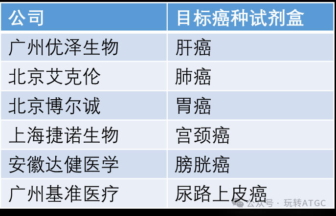 参考资料(审评报告链接): 北京博尔诚-胃癌: https://www.cmde.org.cn//xwdt/shpbg/20200508141000124.html 安徽达健医学-膀胱癌: https://www.cmde.org.cn//xwdt/shpbg/20221117091541126.html 广州优泽生物-肝癌: https://www.cmde.org.cn//xwdt/shpbg/20230627090655107.html 上海捷诺生物-宫颈癌: https://www.cmde.org.cn//xwdt/shpbg/20220901110621132.html 北京艾克伦-肺癌: https://www.cmde.org.cn//xwdt/shpbg/20220223140900607.html 广州基准-尿路上皮癌: https://www.cmde.org.cn//xwdt/shpbg/20240219085318114.html