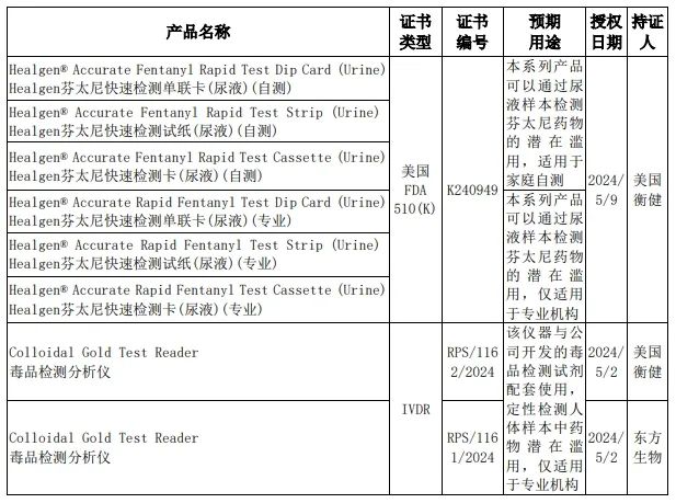 | 东方生物5月15日晚间公告,公司与全资子公司美国衡健生物科技有限公司近日取得芬太尼尿液检测试剂(专业/自测)的美国食品药品监督管理局FDA 510(K)许可证及毒品检测分析仪的欧盟IVDR。