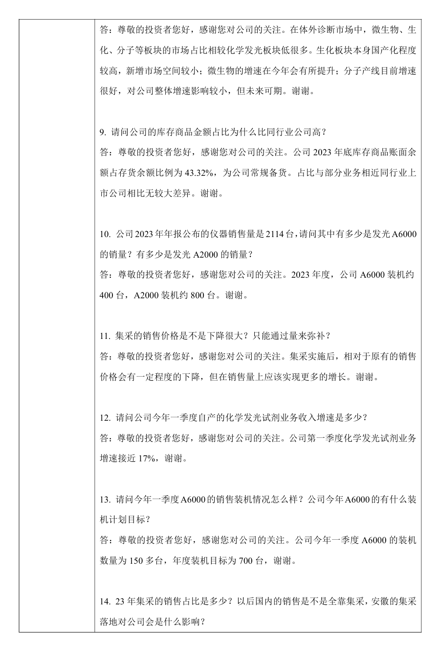 试剂类产品贡献了安图生物超八成营收,其毛利率也在增加。在今日举行的业绩说明会中,公司财务总监冯超姐直言,未来试剂产品占比会有所提升。 此外,公司董事长苗拥军对分子、微生物等板块业务增速做出了预测,而随着集采逐渐成为行业发展趋势,公司董秘房瑞宽认为,全国性的集采会是大概率的事,安徽集采落地对公司有正向影响。其次,相关仪器销量和海外拓展计划也是投资者所关注的话题。 据悉,安图生物主要从事体外诊断试剂和仪器的研发、制造、整合及服务,产品包括免疫、微生物、生化、分子、凝血等检测领域。针对仪器和试剂产能的问题,冯超姐回应称,公司各产品线产能储备充足,此外并未做更详细的说明。 年报显示,2023年,公司试剂类产品营收为38.15亿元,同比增加8.06%,毛利率同比增加4.36个百分点;仪器类产品营收为4.82亿元,同比下降32.99%,毛利率同比减少3.18个百分点。 从细分领域看,体外诊断按照检测方法分类主要包含免疫诊断、生化诊断、微生物、分子诊断、血液学诊断、POCT 等几大方面。苗拥军表示,公司微生物、生化、分子等板块的市场占比相较化学发光板块低很多。生化板块本身国产化程度较高,新增市场空间较小;微生物的增速在今年会有所提升;分子产线目前增速很好,对公司整体增速影响较小,但未来可期。 近年来体外诊断领域的带量集采、阳光采购、DRG等医改政策陆续落地,体外诊断试剂集采成为行业重要的发展趋势。今日国家医疗保障局办公室下发关于加强区域协同,做好2024年医药集中采购提质扩面的通知,称将聚焦重点领域,积极推进2024年集采扩面,深入推进高值医用耗材集中采购,在国家医保局重点指导的全国联采工作中提到了安徽牵头开展肿瘤标志物等体外诊断试剂联盟采购。 2023年12月8日,安徽省牵头的25省体外诊断联盟集采结果公布,据安徽省医保局统计,本次集采企业报价平均降幅为53.9%,预计年节省采购金额近60亿元。其中传染病八项(化学发光法)最高降幅65.2%,最低降幅50.01%,平均降幅54.14%。其中,雅培、罗氏等进口企业以及迈瑞、安图、新产业等国内龙头企业均以高于50%的降幅全部拟中选。 房瑞宽表示,2023年集采的销售占比数据未统计,预计全国性的集采会是大概率的事情,安徽集采落地会对公司产生正向影响。此外,其补充说明,集采实施后,相对于原有的销售价格会有一定程度的下降,但在销售量上应该实现更多的增长。 而在仪器领域,年报显示,2023年公司仪器类产品销售量为2114台,全自动磁微粒化学发光免疫检测系统多款仪器中,目前A2000Plus、A1000、A1000S、A6000已获医疗器械注册证,据苗拥军透露,2023年度,公司A6000装机约400台,A2000装机约800台。此外,今年一季度A6000的装机数量为150多台,年度装机目标为700台。 在海外拓展计划方面,安图生物方面在回答投资者提问时表示,公司正加快国际市场拓展步伐,推动产品市场准入、营销及服务本土化等方面工作,已有在部分国家或地区建立海外子公司的相关规划,未来海外业务占比会逐步提升。 公告原文 |