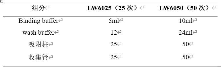 寡核苷酸纯化试剂盒 产品介绍:本试剂盒使用特殊的吸附膜和Bingding buffer,能够高效的将寡核苷酸片段结合到吸附柱上,适用于≥15nt-2kb片段的DNA的纯化回收,将寡核苷酸洗涤并浓缩到少量水(≥10 μl)中。纯化的寡核苷酸步骤简单,纯化后的寡核苷酸适用于抗体偶联、杂交,凝胶移位分析,酶促反应,连接,测序,微阵列分析等。吸附柱的结合DNA的量可达到10ug单链DNA或5ug双链DNA,回收率在85%以上。 产品应用范围:同位素和染料去除-在体外标记反应后,有效地去除DNA中未掺入的荧光(如FITC, DIG, Cy3, Cy5, FAM等);酶促反应中的DNA片段清除;DNA进行脱盐等。 产品编号:LW6025/LW6050 包装规格:25次/50次 试剂盒组成 保存 试剂盒于常温运输,可于室温保存 准备工作 使用前,25次规格的wash buffer中加入48ml的100%乙醇,50次规格的wash buffer中加入96ml的100%乙醇。 标准纯化步骤: 1、加100ul的Binding buffer到50ul的样本中(为了尽量减少移液误差,需将样品体积调整到50µl); 2、加入400ul的95%以上的乙醇,用移液器吹吸混匀; 3、吸附柱置于收集管中,将步骤2中的混合液转移到吸附柱中,12000g离心30秒,弃掉收集管中的液体; 4、向吸附柱中加入750ul的wash buffer,12000g离心1分钟,弃掉收集管中的液体;(wash buffer首次使用前请检测溶液是否已加入正确量的无水乙醇) 5、将吸附柱置于收集管中,再次12000g离心1分钟; 6、将吸附柱置于干净的1.5ml离心管中,加入15μl的水,室温静置2分钟,12000g离心1分钟。TE缓冲液也可用于洗脱;洗脱后的寡核苷酸可立即使用或冷冻保存。 |