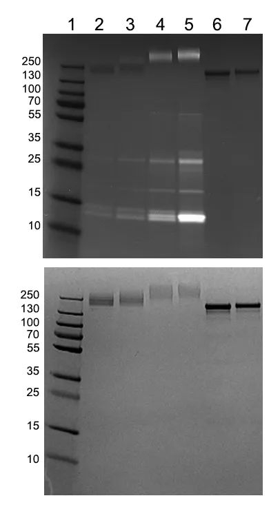 寡核苷酸偶联试剂盒 1.产品概述 寡核苷酸偶联试剂盒可高效的生成寡核苷酸偶联抗体,本试剂盒使用的生物偶联试剂含有具有反应活性的末端,可与含有氨基的抗体、蛋白、多肽或氨基修饰的寡核苷酸进行偶联反应。该试剂盒包括阳性对照允许用户确认偶联反应是否正常工作,可用于抗体与 20-120 的单链寡核苷酸或双链寡核苷酸偶联,偶联使用的寡核苷酸应包含氨基修饰的末端。 规格1次份试剂盒内包含1对抗体的标记所需要的活化剂及阳性对照抗体和阳性对照寡核苷酸,货号LW-AOC-001。 规格 3次份试剂盒包含3对抗体的标记所需要的活化剂以及阳性对照抗体和阳性对照寡核苷酸,货号LW-AOC-003。 在偶联化学反应中,寡核苷酸的和抗体的浓度及缓冲液方法需符合特定参数,详见本说明书。 2.试剂盒提供的材料和保存方法 收到试剂盒后,立即将试剂组分及耗材置于标注的温度条件下保存。 自备设备:台式常温高速离心机,适配1.5ml或者2ml离心管、超微量分光光度计。 自备试剂耗材:脱盐柱,寡核苷酸纯化试剂盒,超滤管,0.2ml、1.5ml和2ml离心管,PBS等。 3.技术注意事项 3.1寡核苷酸预偶联注意事项 该试剂盒可用于单链或双链寡核苷酸的偶联,单链偶联长度在20-120个碱基范围内,并且寡核苷酸的末端有一个氨基的修饰。5`位末端氨基修饰的寡核苷酸的偶联效率略高于3`末端。双链寡核苷酸的长度可达90个碱基,但只有一端是氨基修饰。 寡核苷酸在超纯水中或者是缓冲液B中溶解,建议使用超纯水溶解,浓度范围在50-200μM。如果寡核苷酸的浓度高于200μM,建议用超纯水稀释。 3.2 抗体预偶联注意事项 试剂盒提供的抗体的浓度范围在1-10mg/ml,抗体浓度不应低于1mg/ml,如果抗体浓度偏高建议稀释到合适的浓度范围。为了得到最理想的结果,建议抗体的缓冲液为水或者是PBS中,如果含有防腐剂、甘油等保护液建议进行缓冲液置换。 4.实验步骤: 4.1活化试剂预处理 将缓冲液A、缓冲液B和缓冲液C平衡至室温,缓冲液A在4℃会凝固,需在室温溶解后使用。在涡旋震荡器上震荡2-5秒,充分混匀后,在掌上离心机上,短暂离心,备用。 4.2.寡核苷酸的活化与纯化 寡核苷酸活化,将合成的寡核苷酸用超纯水溶解成0.1-0.2mM,取10μl的寡核苷酸加入2μl稀释后的寡核苷酸活化剂,2μl的缓冲液A,10μl的缓冲液B,震荡混匀并短暂离心,室温避光孵育2小时。(此等待过程可进行步骤4.3中的操作)。 注:此步骤可等体积放大反应体系一倍。 阳性对照寡核苷酸组:取10μl阳性对照寡核苷酸加入2μl寡核苷酸活化剂,加入2μl缓冲液A,10μl缓冲液B,震荡混匀,短暂离心后避光孵育2小时。 本试剂盒提供的阳性寡核苷酸浓度约0.2mM,长度为50bp。 活化寡核苷酸的纯化去除未结合的活化剂。 4.3 抗体的活化与纯化 抗体活化反应体系:将抗体用缓冲液B调整到浓度约1-10mg/ml,取100μg的抗体加入2μl抗体活化剂,充分震荡混匀并短暂离心,室温避光孵育1小时。 阳性对照抗体活化:取出6μl阳性对照样品加入4μl缓冲液C加入1μl抗体活化剂,震荡混匀后,短暂离心,室温避光孵育1小时。 本试剂盒提供的阳性抗体浓度约10mg/ml,摩尔浓度约6.7μM。 活化抗体的纯化去除未结合的活化剂。 4.4抗体与寡核苷酸偶联与纯化 活化抗体与寡核苷酸的偶联反应 将纯化的抗体与纯化后寡核苷酸按照一定的摩尔比混合,可适当添加缓冲液C,调整反应总体积及抗体的浓度便于后续的检测。4℃避光反应12-16小时。 例如纯化后阳性对照抗体浓度1mg/ml,摩尔浓度6.7μM,阳性寡核苷酸浓度360ng/μl,摩尔浓度25μM;阳性抗体与阳性寡核苷酸按照1:5的摩尔比进行偶联反应,偶联抗体重量10μg,活化阳性抗体体积10μl阳性加入寡核苷酸13.4μl,加入一定量缓冲液C使活化抗体浓度在0.2-0.5 mg/ml范围。 4.5偶联产物纯化去及保存 使用合适的纯化方法去除未结合的游离寡核苷酸。 寡核苷酸偶联抗体的长期稳定性取决于多个因素,包括抗体和寡核苷酸本身、保存温度和保存条件。若短期使用建议在超滤缓冲液中-20摄氏度保存,如果长期使用及后续实验不受干扰,可在50%甘油条件下保存。 偶联反应剩余的活化寡核苷酸和活化抗体可-20℃保存一个月。 5 寡核苷酸偶联抗体的分析 寡核苷酸偶联抗体的效果可通过凝胶电泳直观检验。 5.1 准备2-5ug偶联抗体(超滤前或超滤后均可)与等量未偶联抗体(作为对照),加入4x非还原型凝胶上样缓冲液(非试剂盒内提供)混合,并在100℃下加热10分钟。 5.2 样本冷却后,上样至SDS-PAGE凝胶上,推荐使用4%-20%的梯度凝胶,以便取得最佳结果。在凝胶电泳结束后用考马斯亮蓝染色剂染色并脱色,脱色结束后再用EB染色。分析凝胶中是否存在寡核苷酸偶联抗体,及寡核苷酸去除效果。 实验示例分享 下图为每个孔内加入2ug偶联抗体,寡核苷酸偶联后非还原SDS-PAGE: 上图为EB成像结果,下图为考马斯亮蓝成像结果; 条带1:蛋白marker 条带2:抗体与oligo摩尔比为1:1 条带3:抗体与oligo摩尔比为1:2 条带4:抗体与oligo摩尔比为1:5 条带5:抗体与oligo摩尔比为1:10 条带6:未活化抗体 条带7:活化的抗体 结果显示:寡核苷酸摩尔比越高,结合抗体的量就会越多,抗体与寡核苷酸摩尔比达到1:5,显示几乎所有抗体均与寡核苷酸结合。 偶联后,通过游离寡核苷酸去除条件摸索:下图为每个孔内加入1.5ug偶联抗体,偶联后非还原SDS-PAGE凝胶电泳: 条带1:活化的寡核苷酸 条带2:偶联产物超滤纯化12次 条带3:偶联产物超滤纯化7次